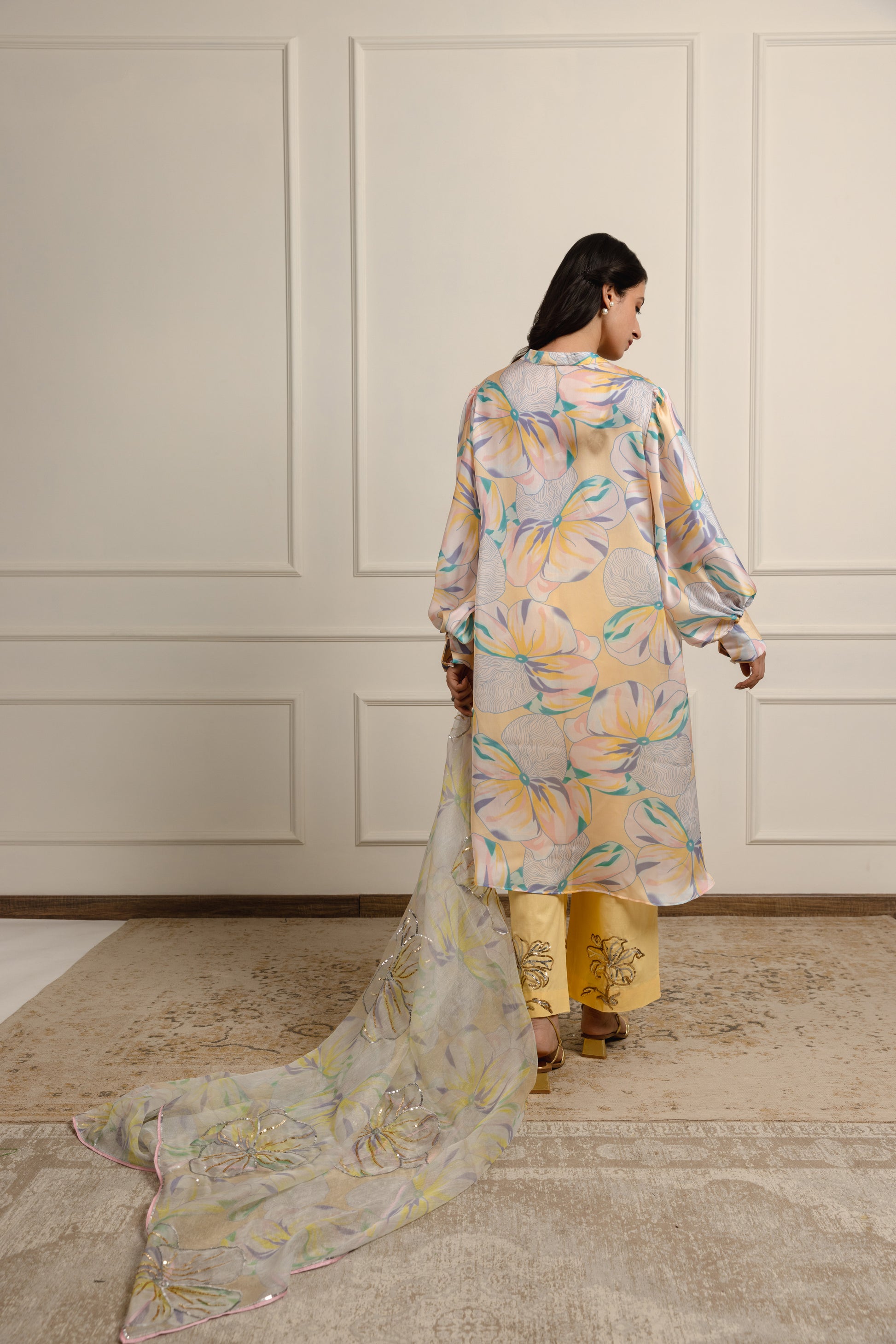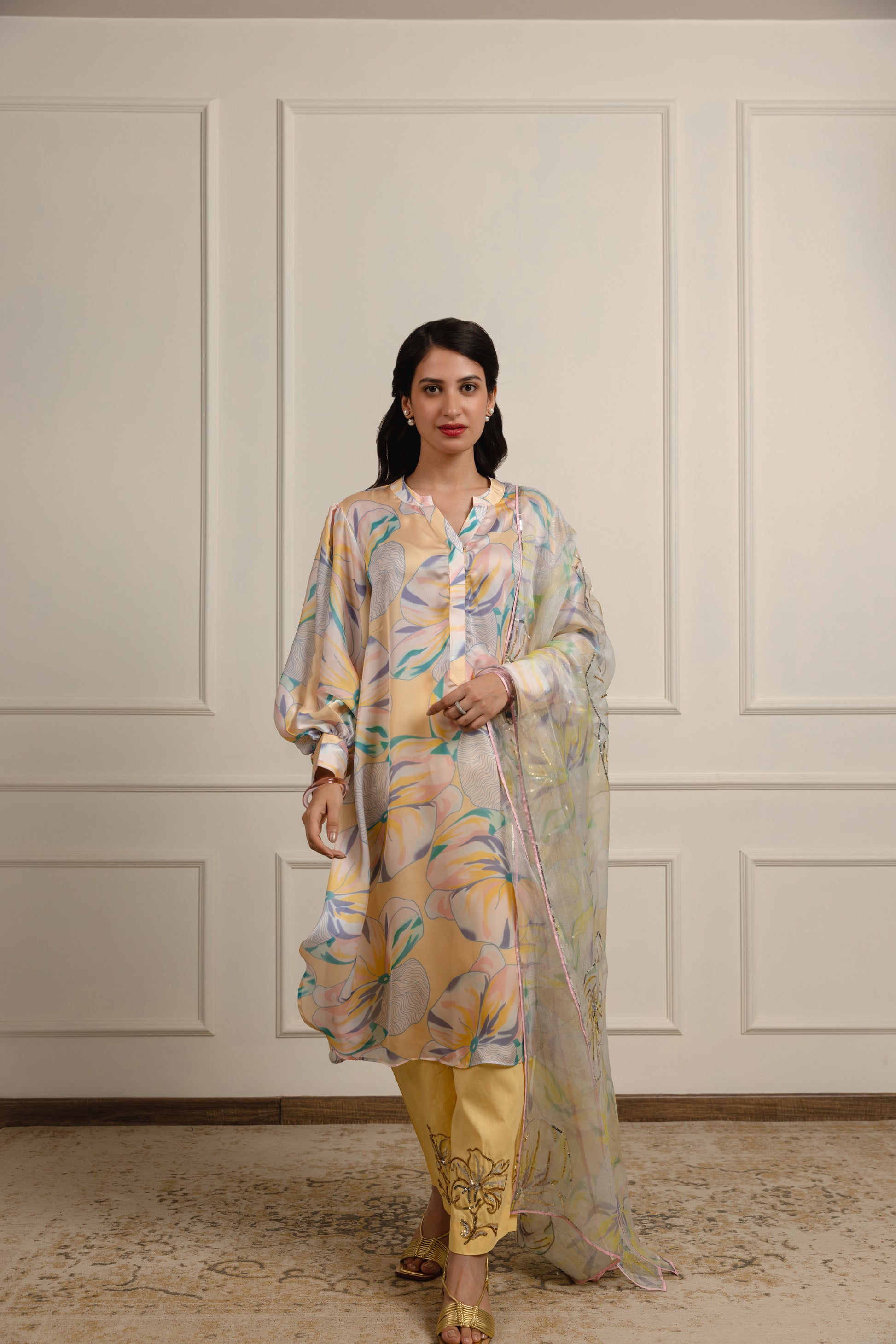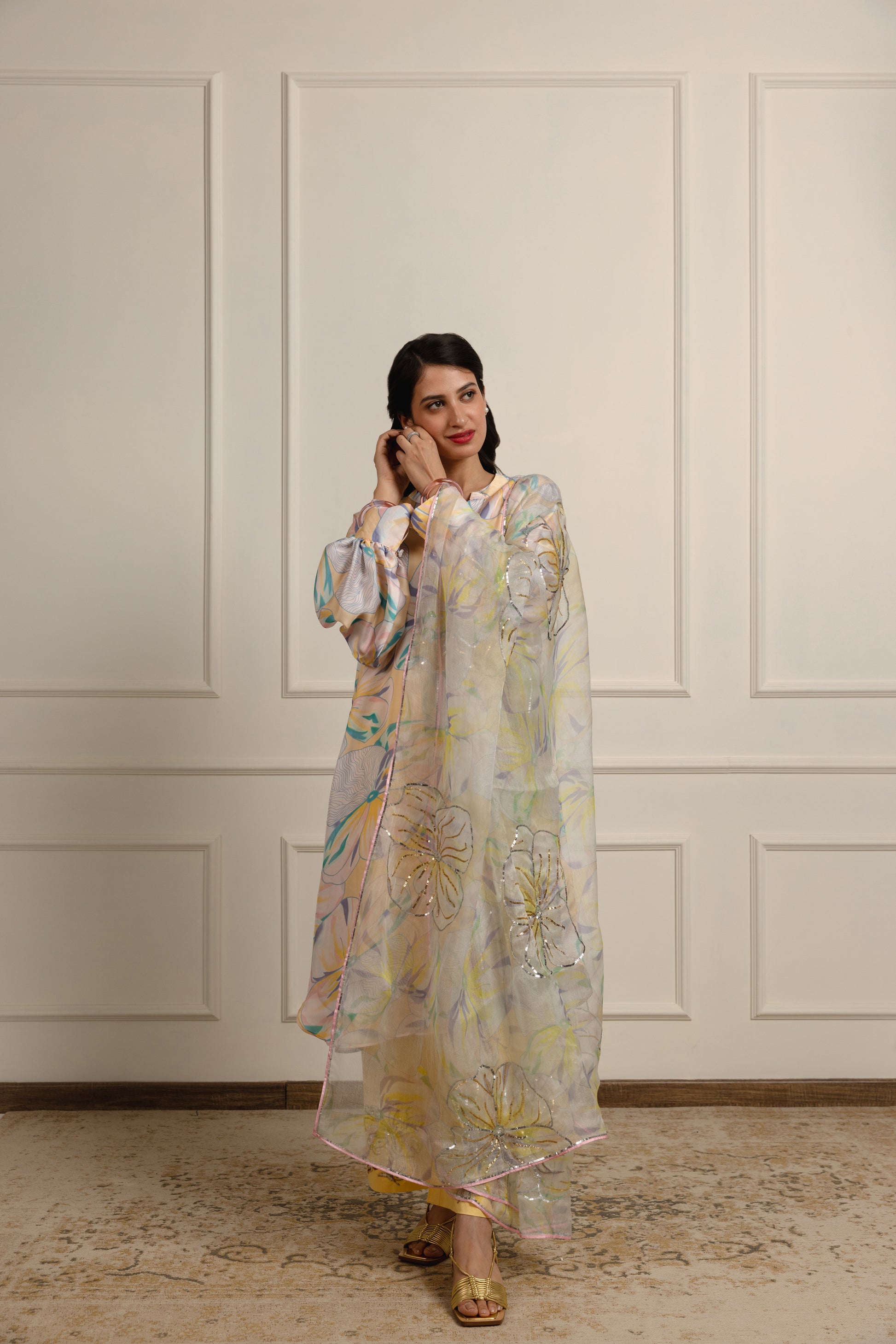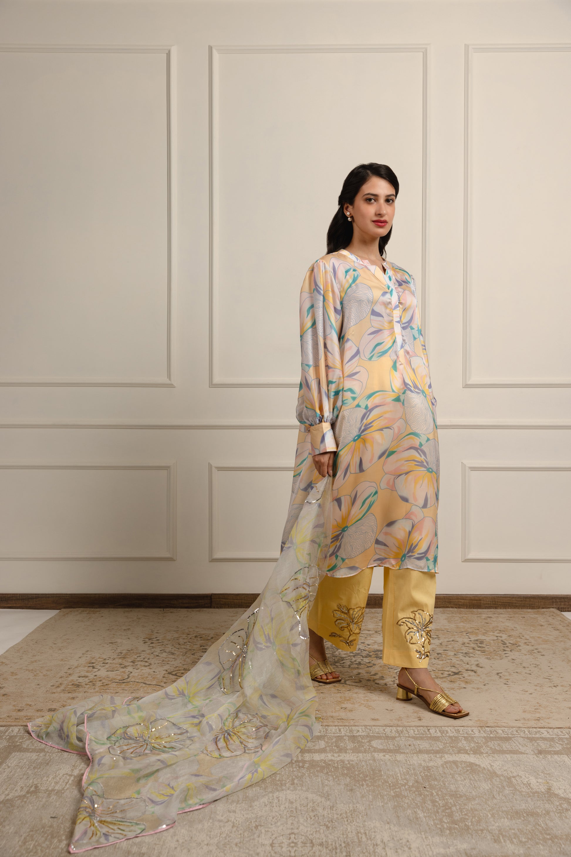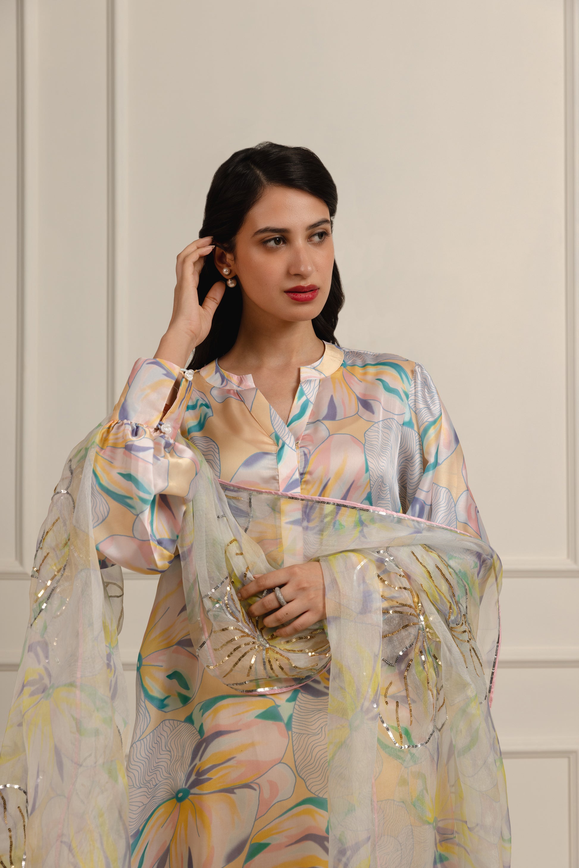 Abstract peony printed silk satin peasant shirt styled kameez paired with poplin pants and printed dupatta embroidered with sequins and diamante.