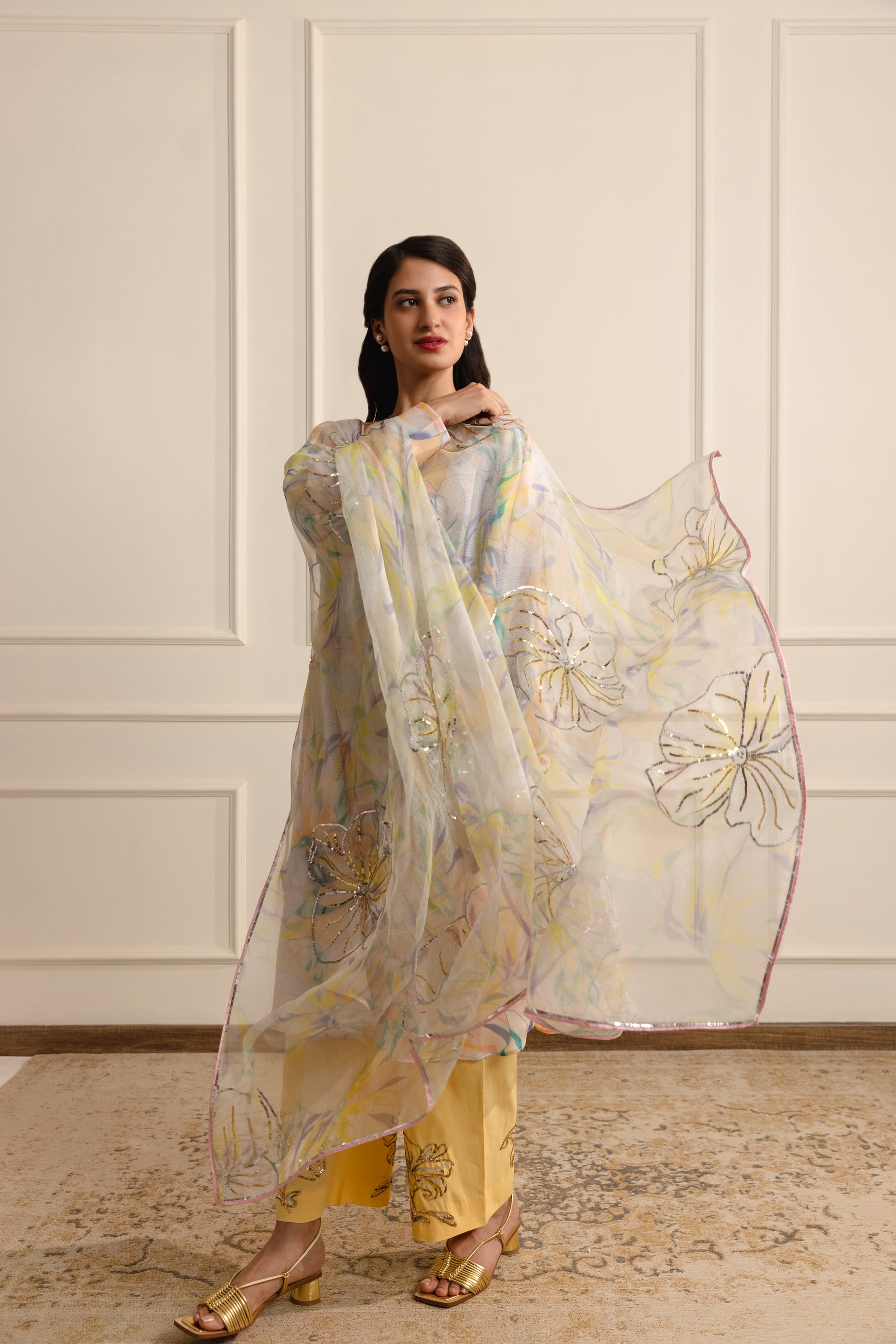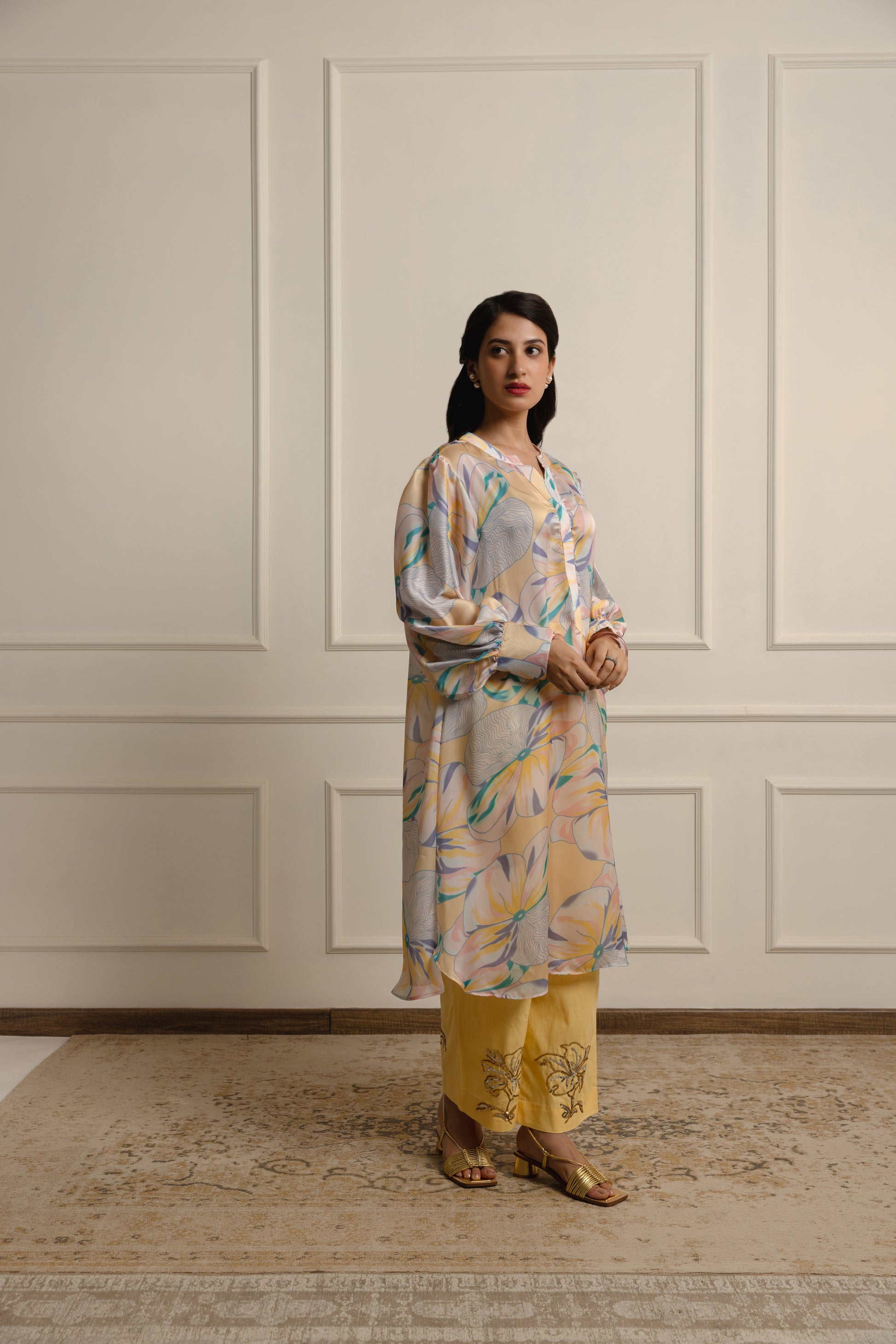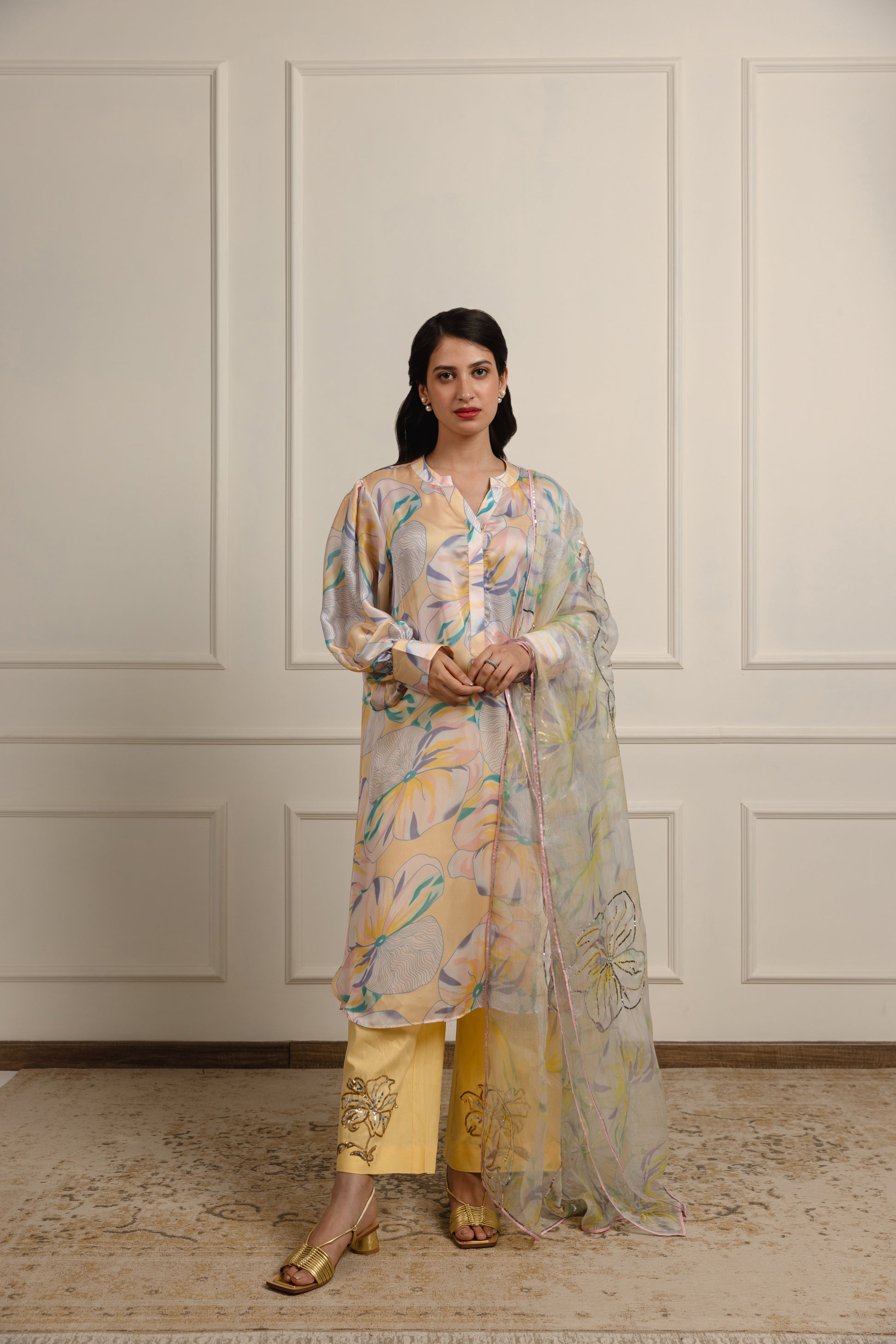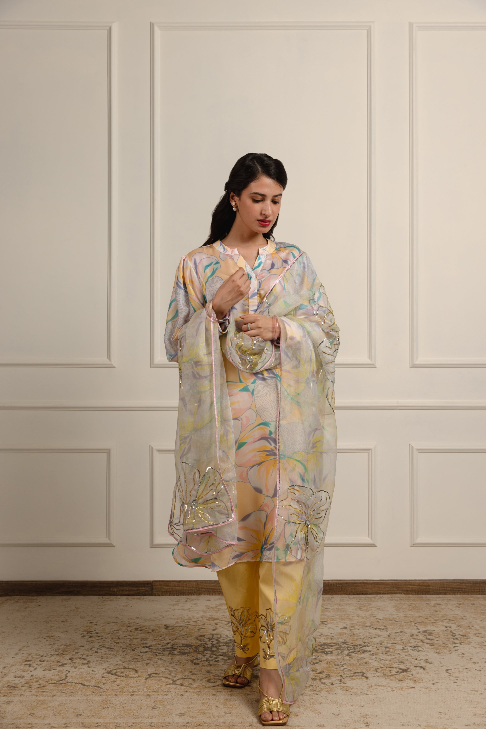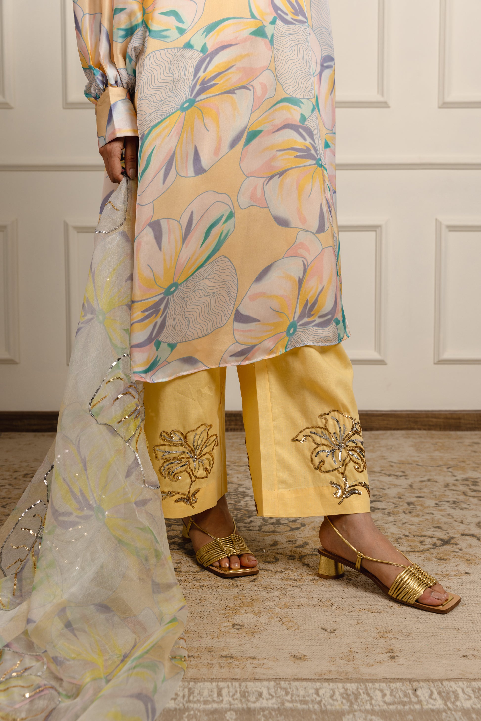 Abstract peony printed silk satin peasant shirt styled kameez paired with poplin pants and printed dupatta embroidered with sequins and diamante.