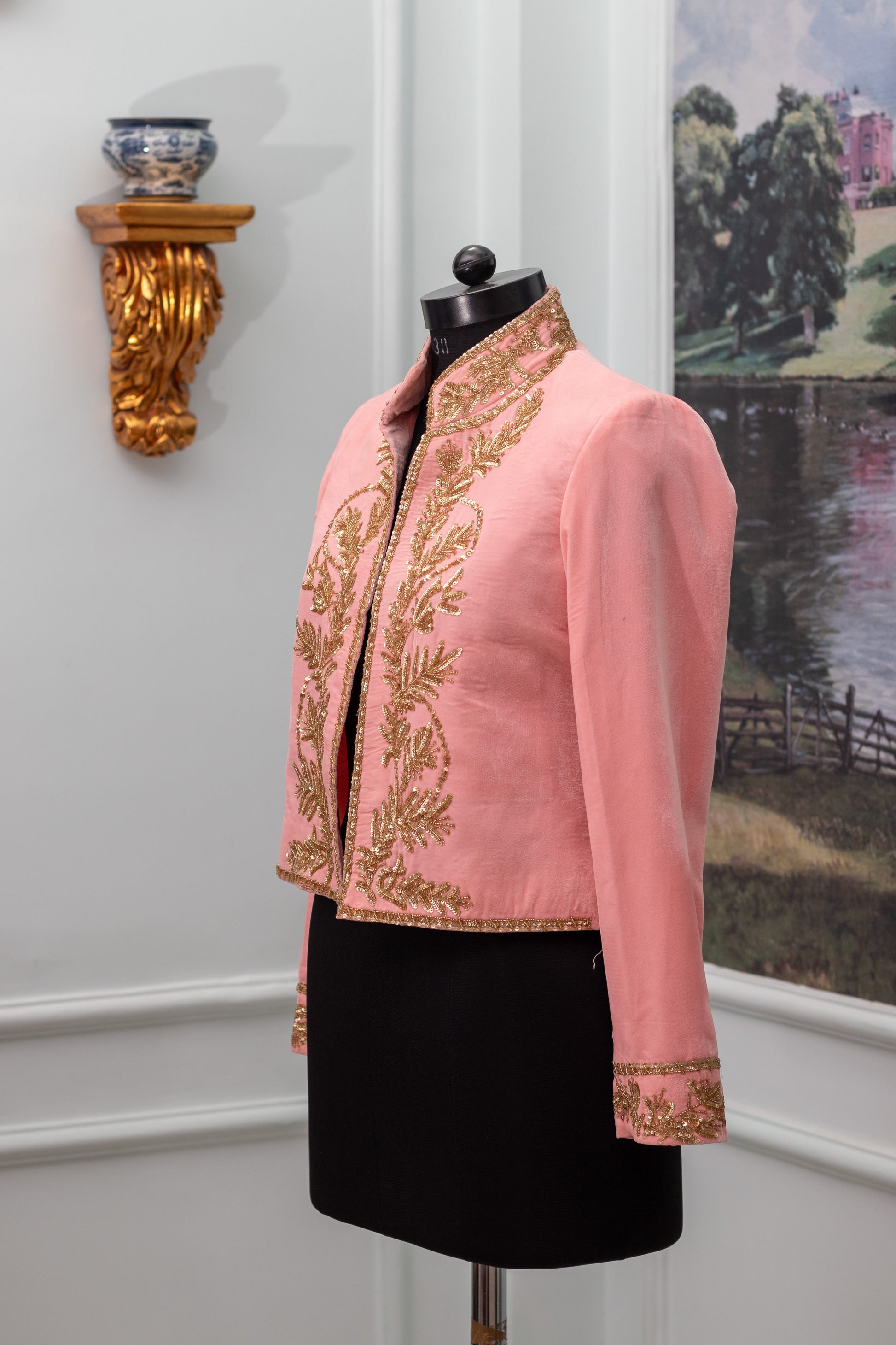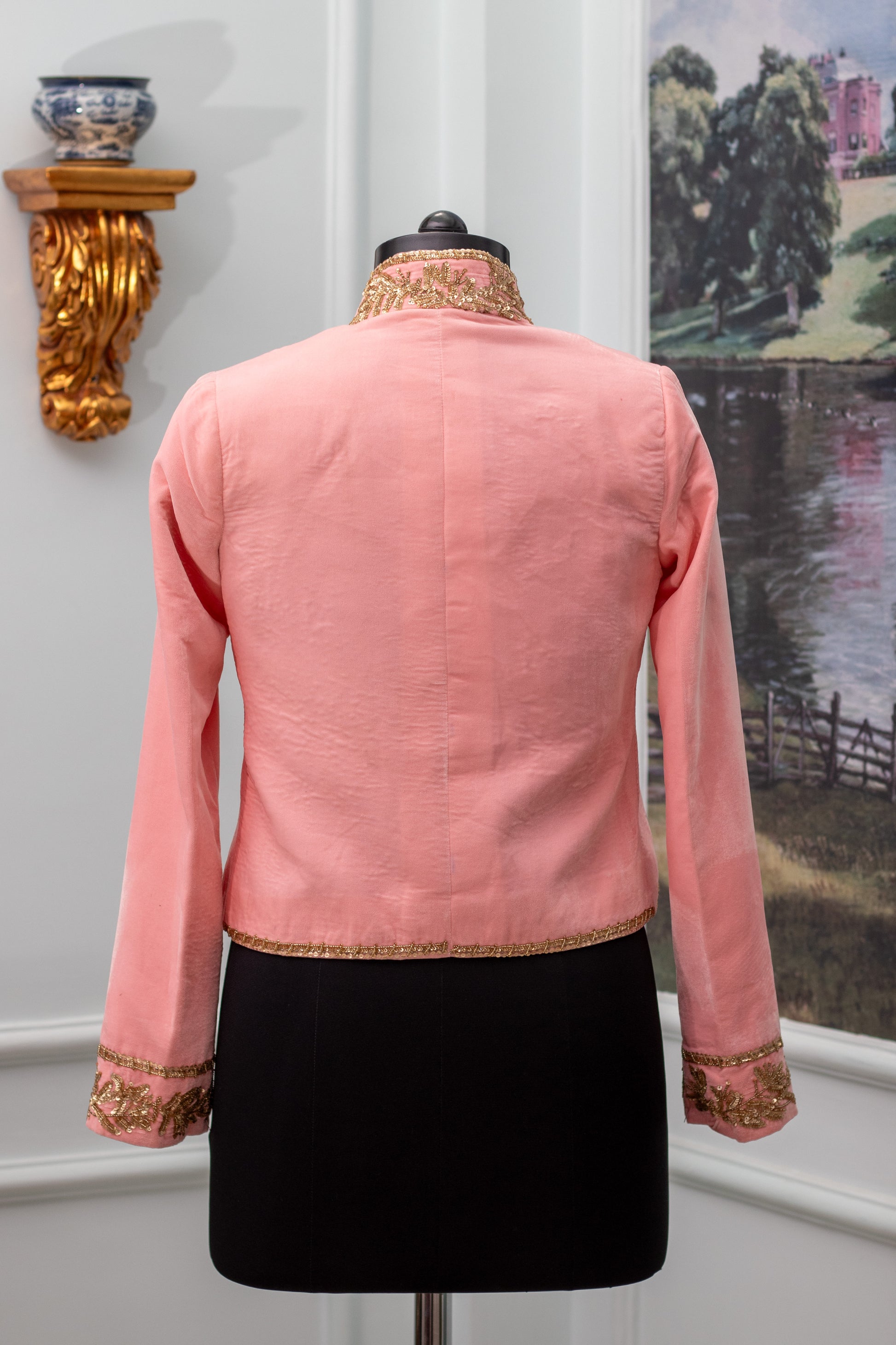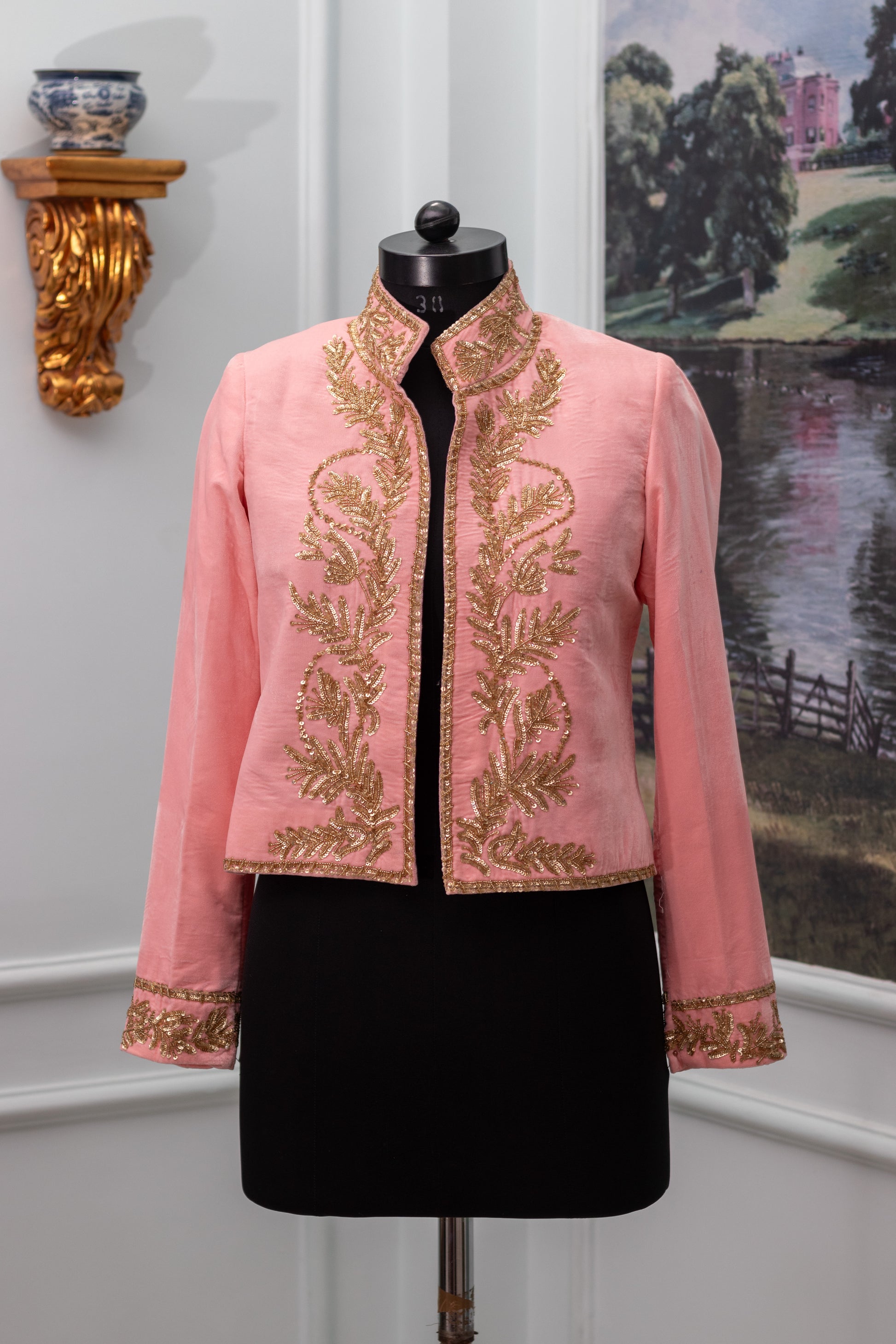 Blush pink silk velvet jacket with sequin hand embroidery lined with printed satin lining.