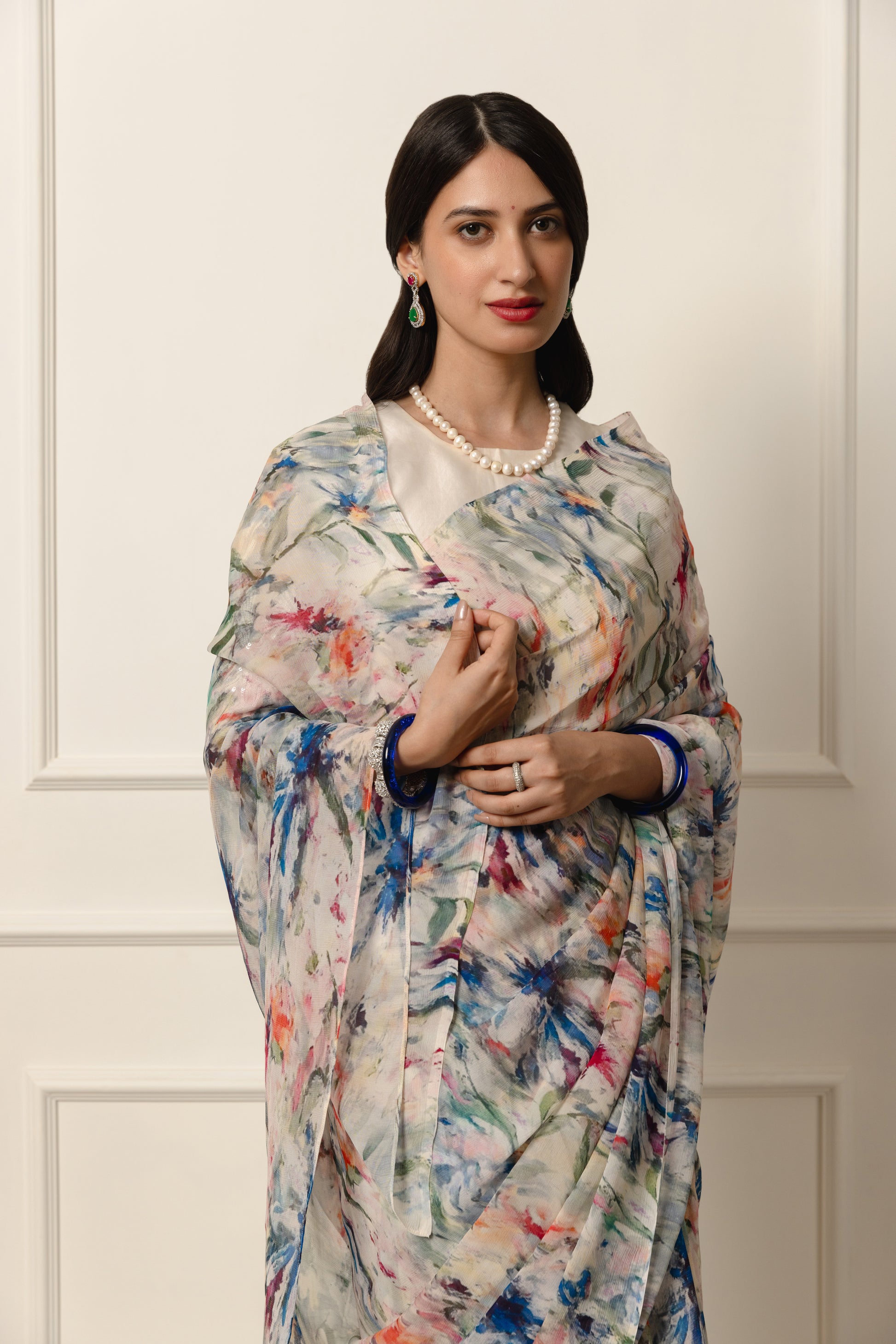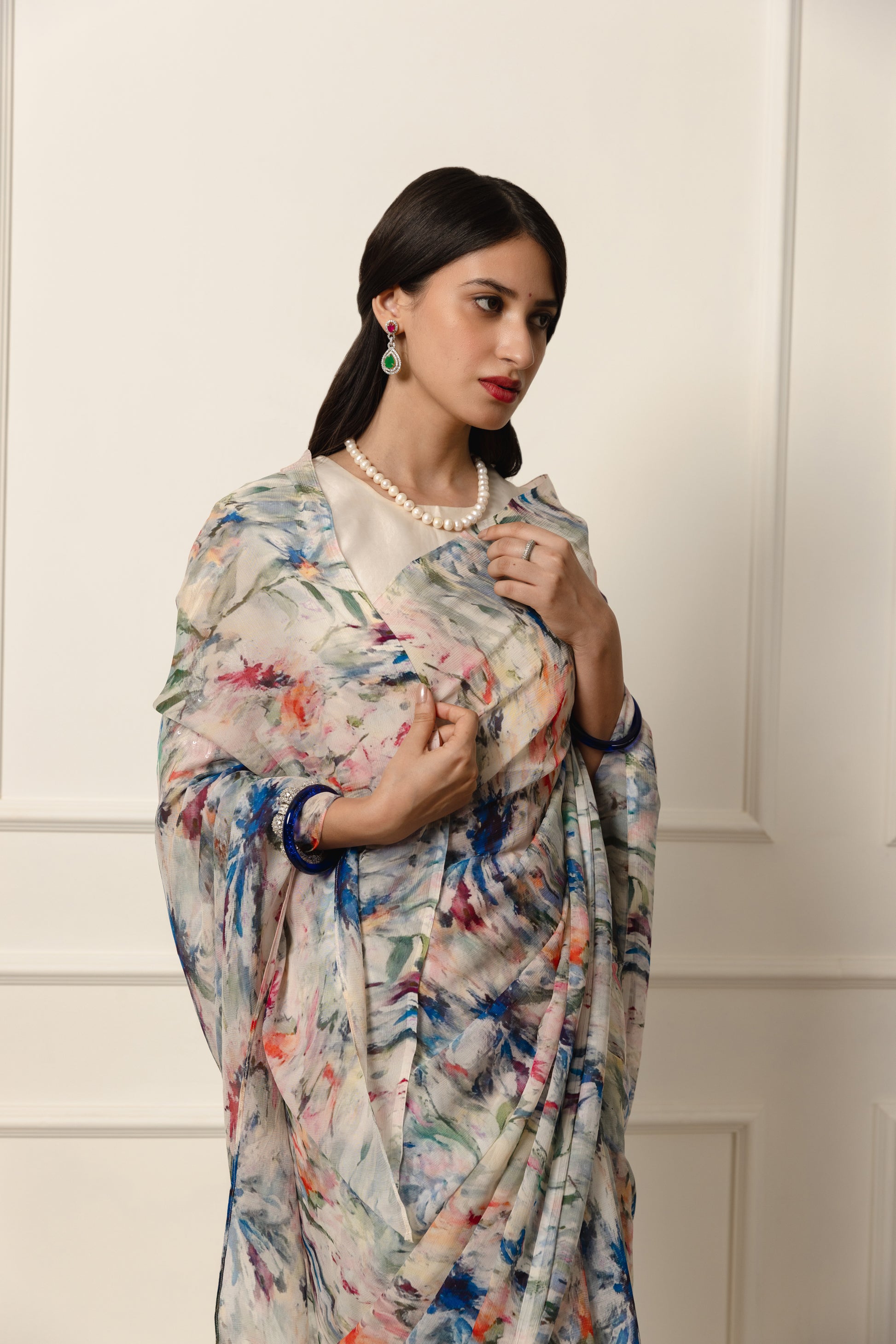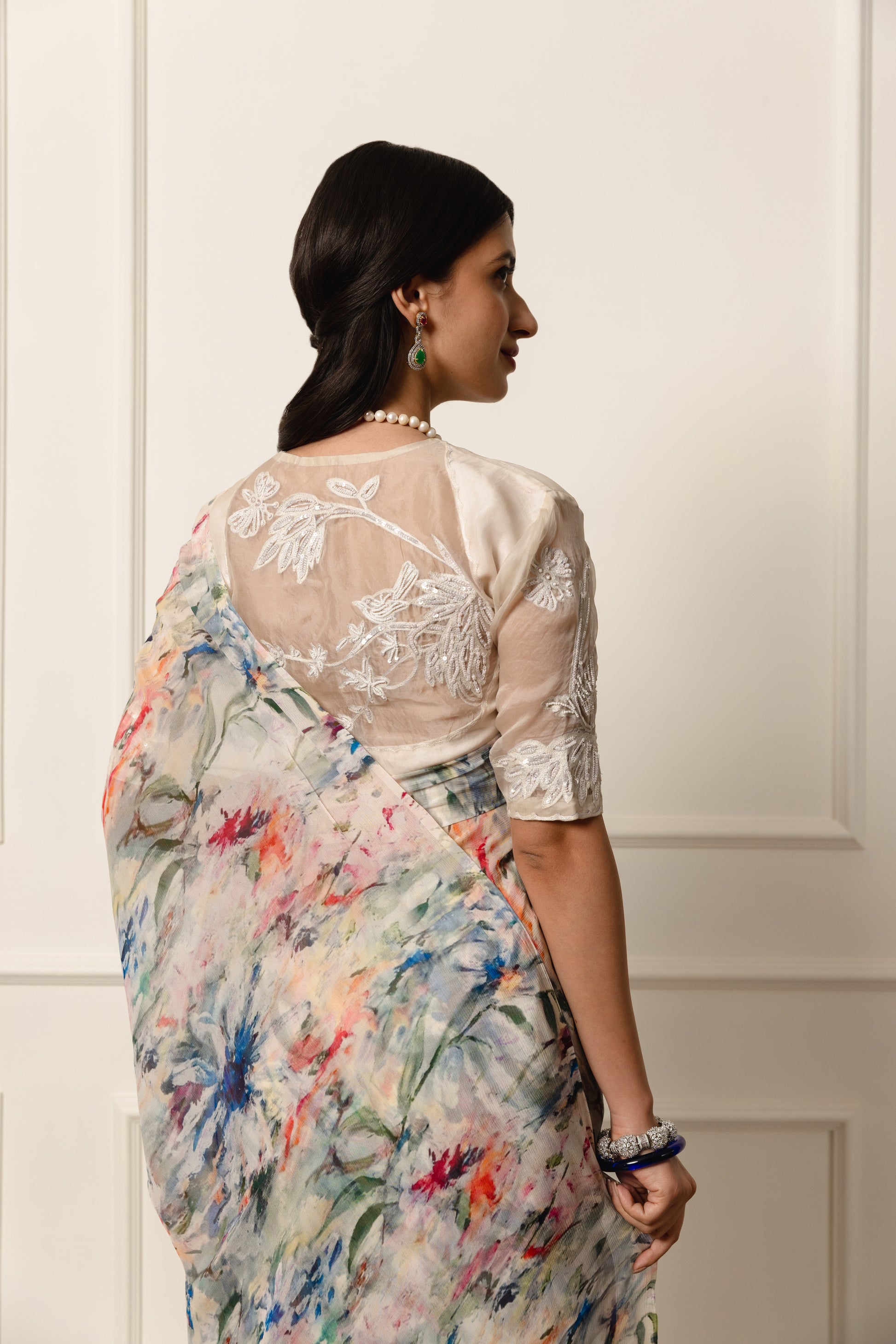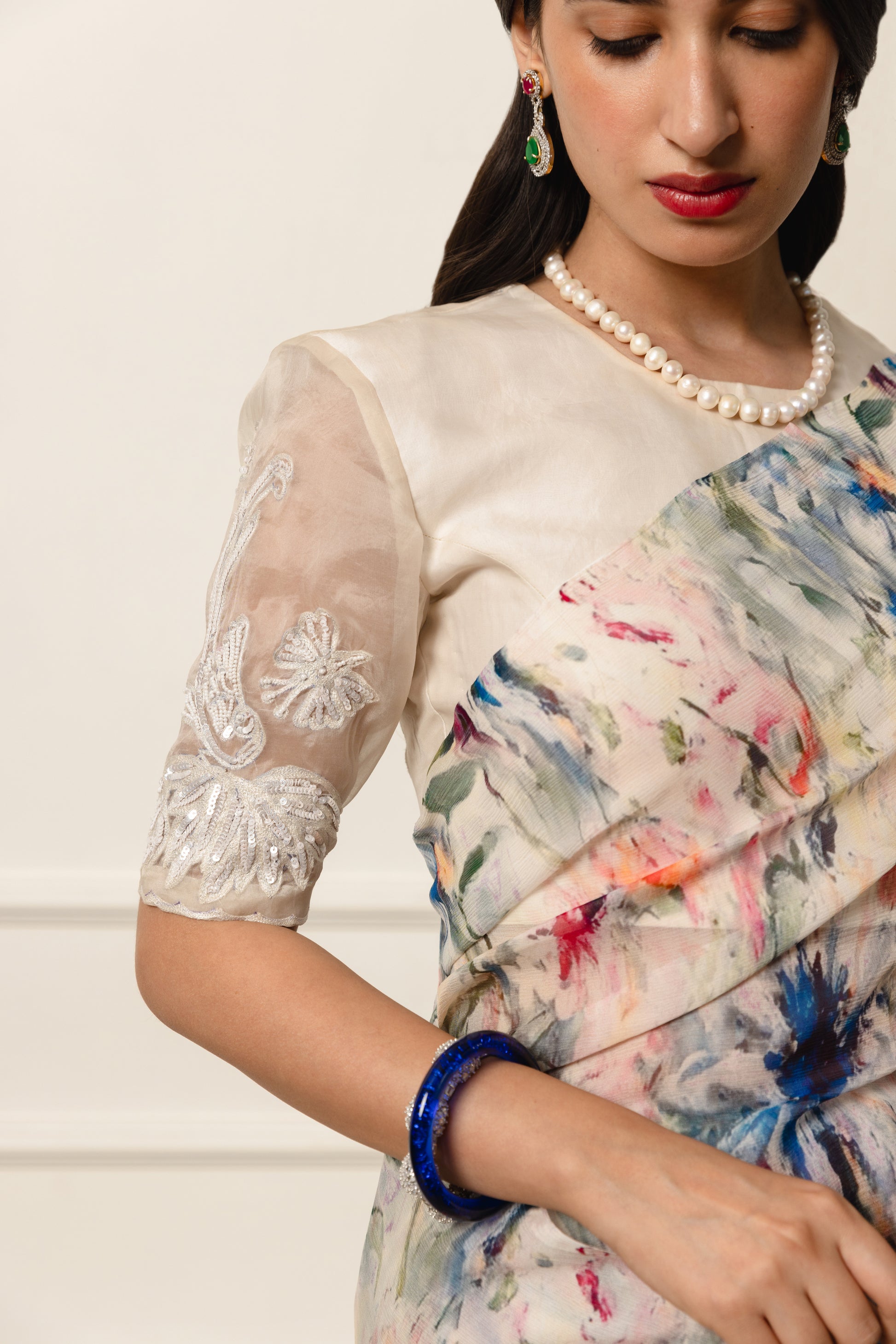 Printed French chiffon saree with a matching embroidered silk organza blouse piece.