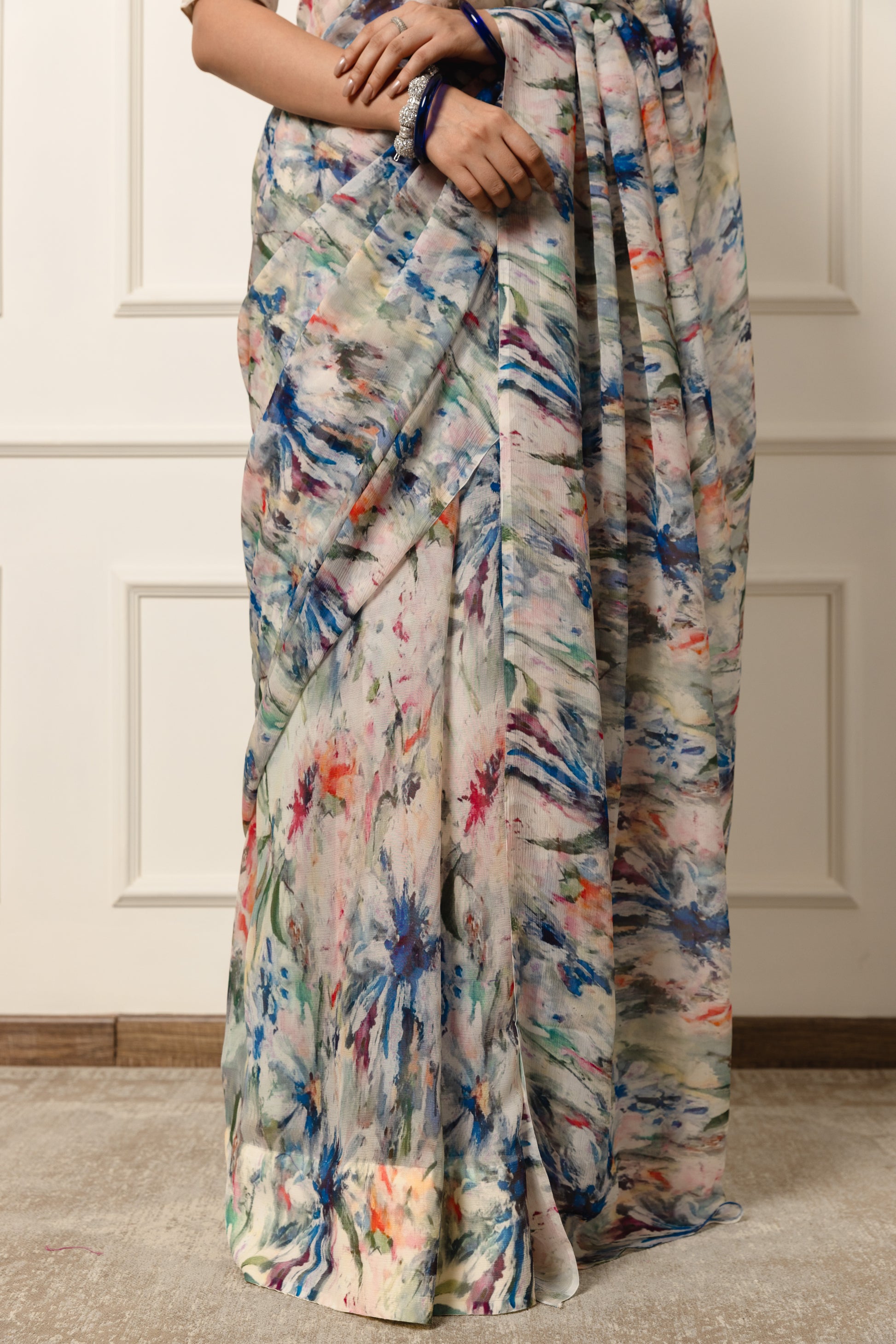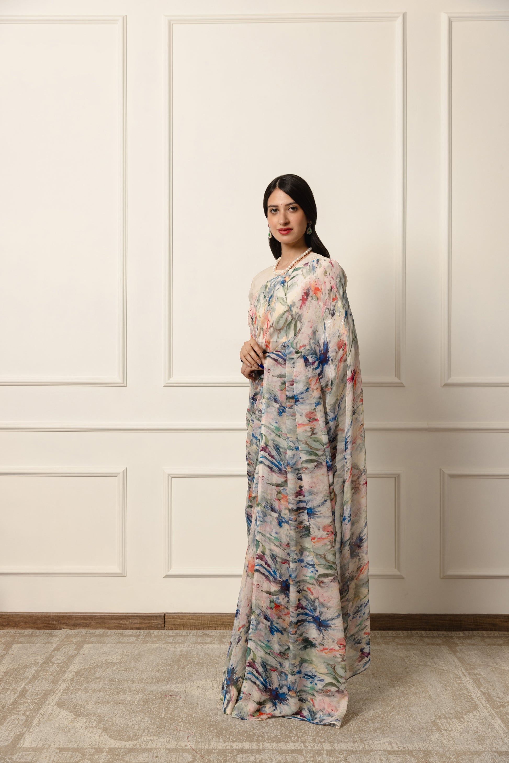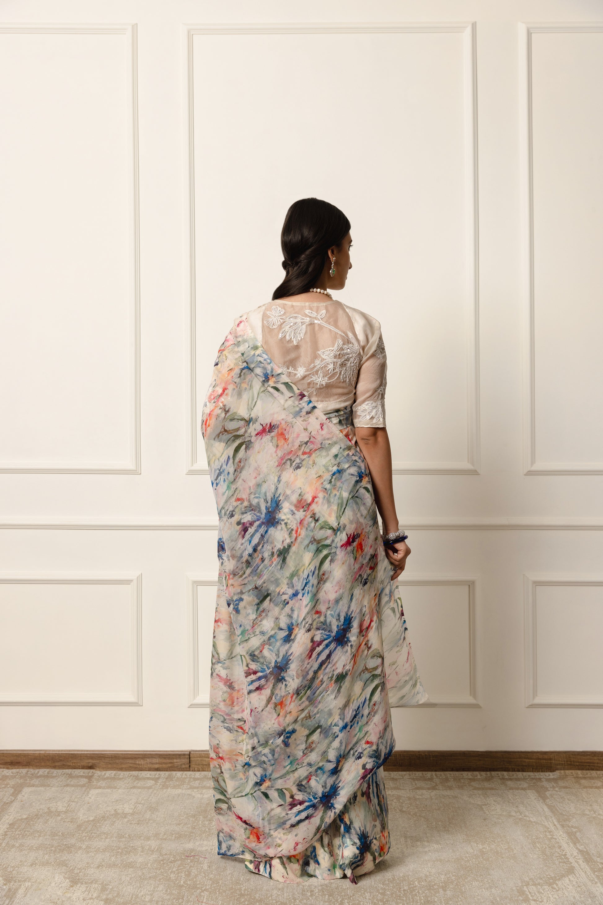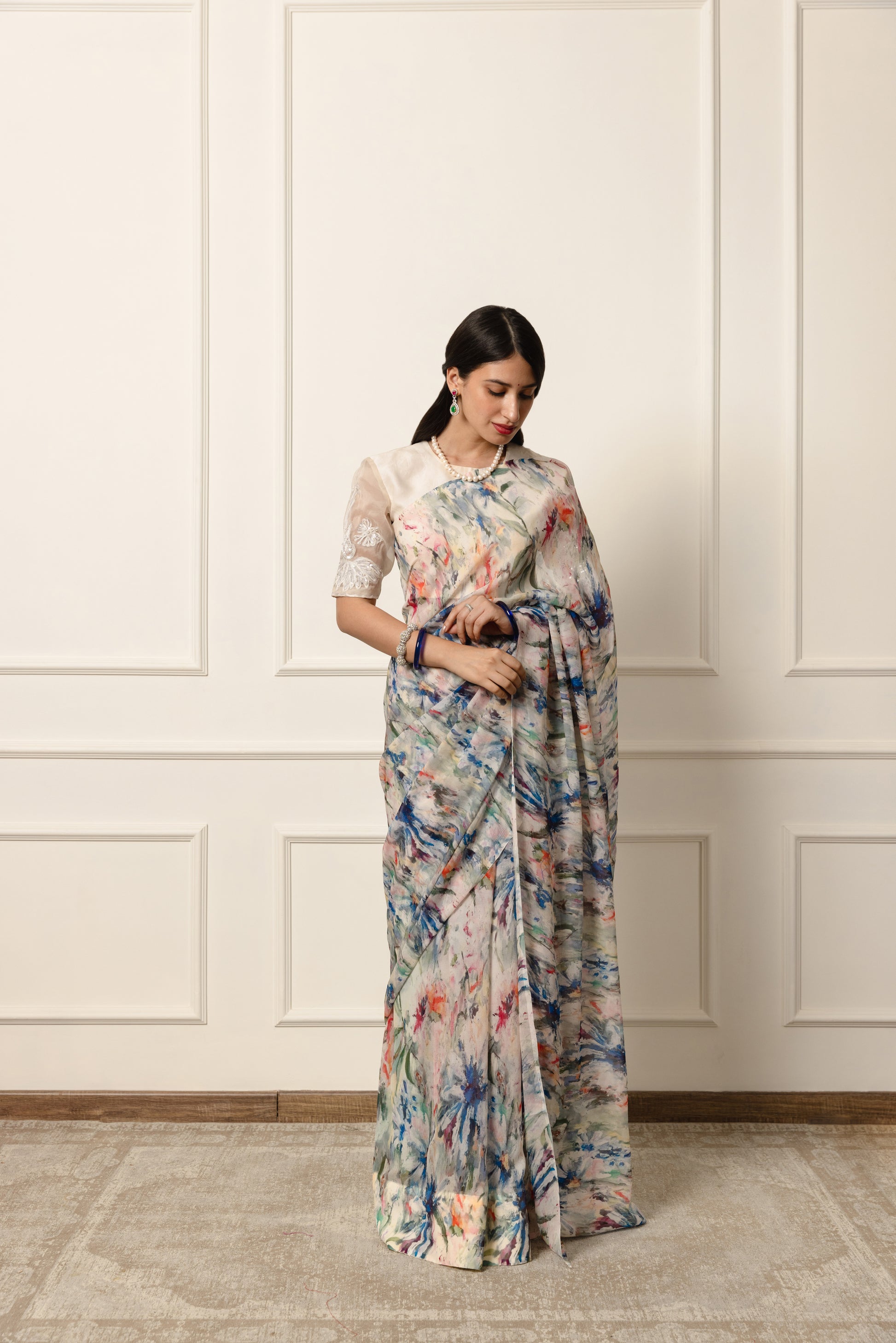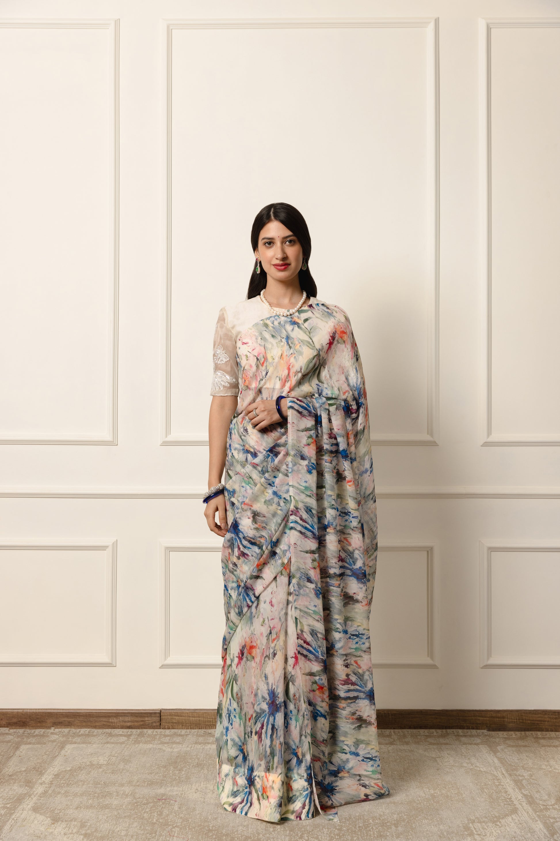 Printed French chiffon saree with a matching embroidered silk organza blouse piece.