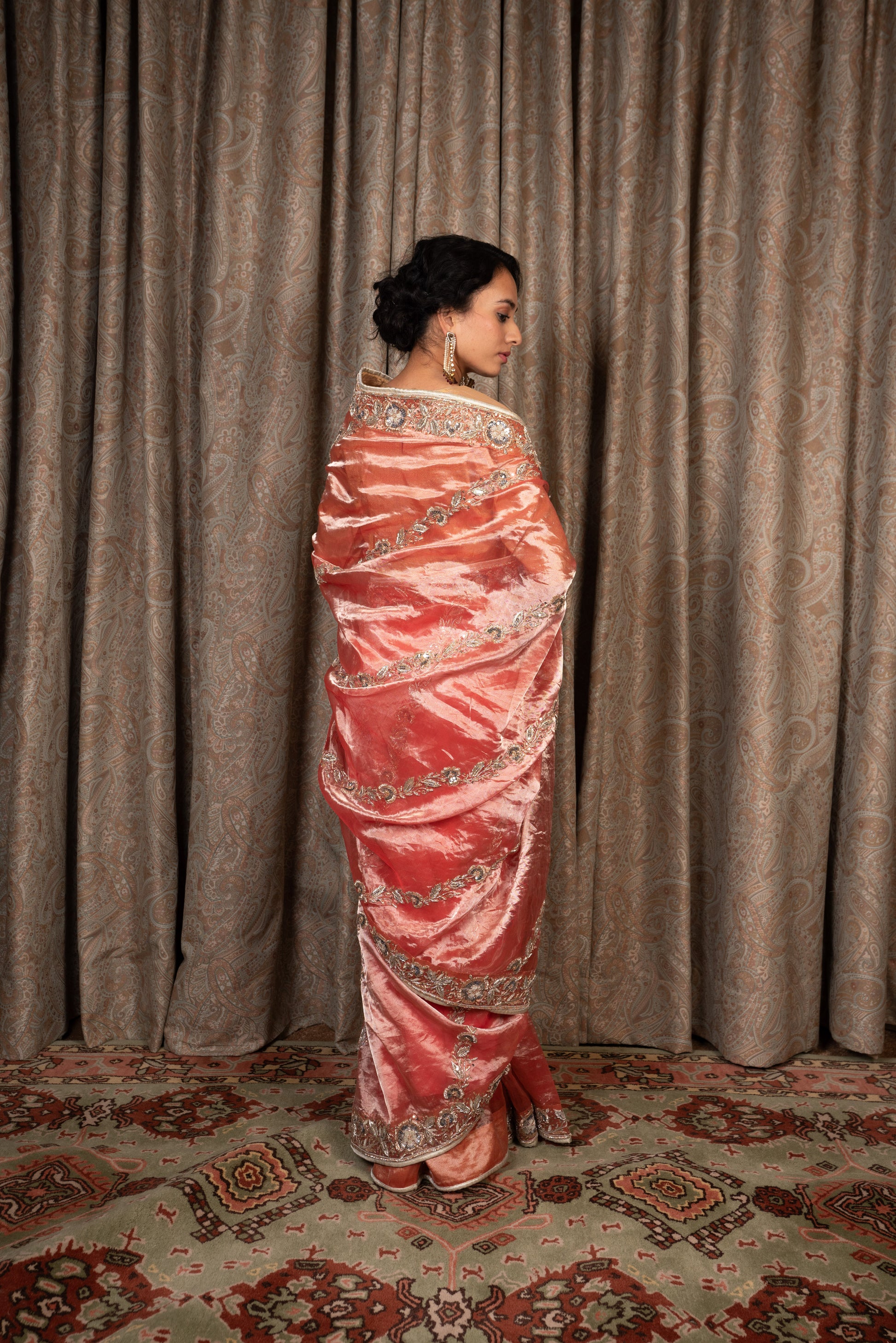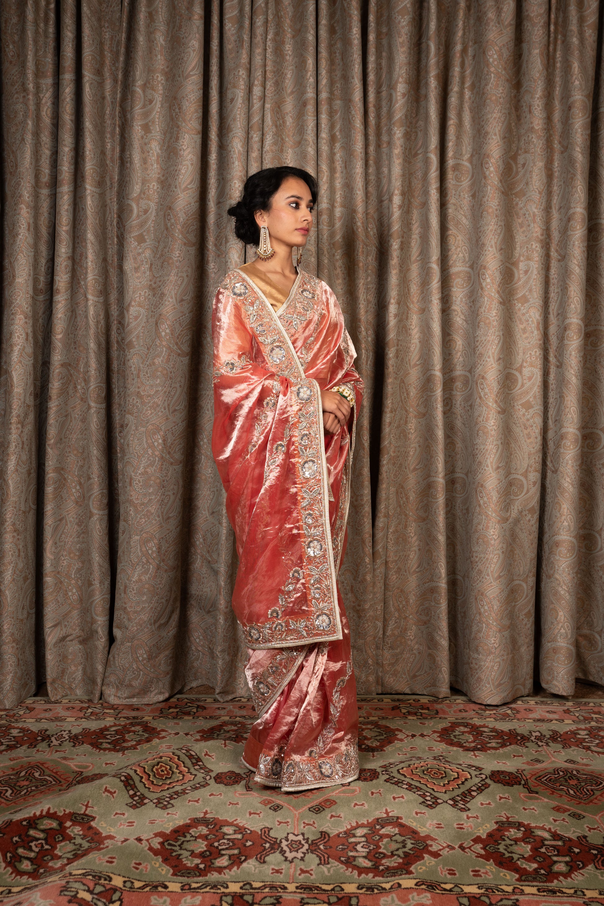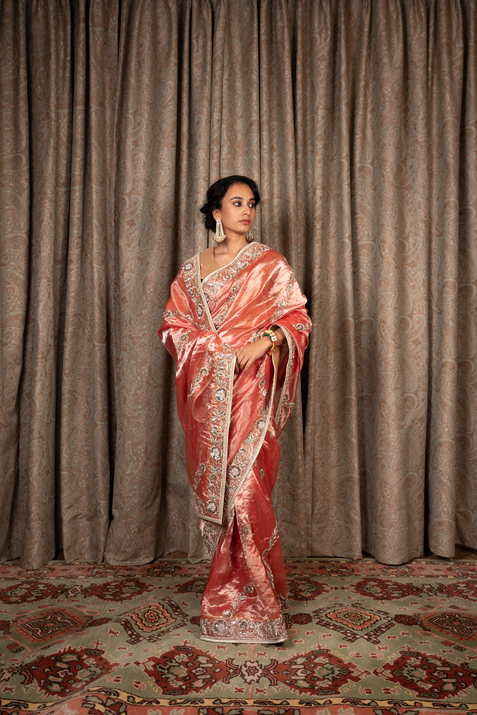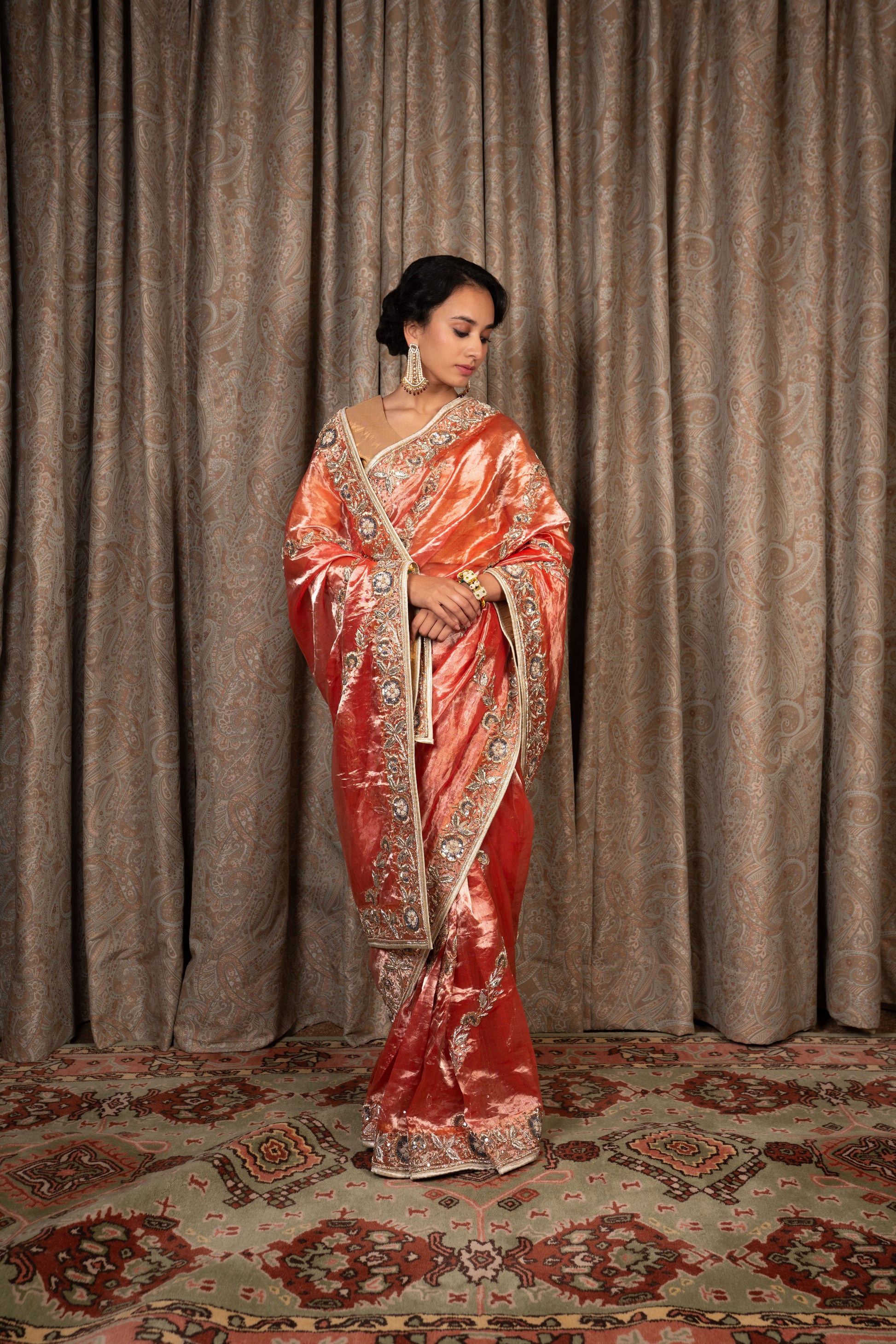Red Tissue saree embroidered with zardozi and sequins.