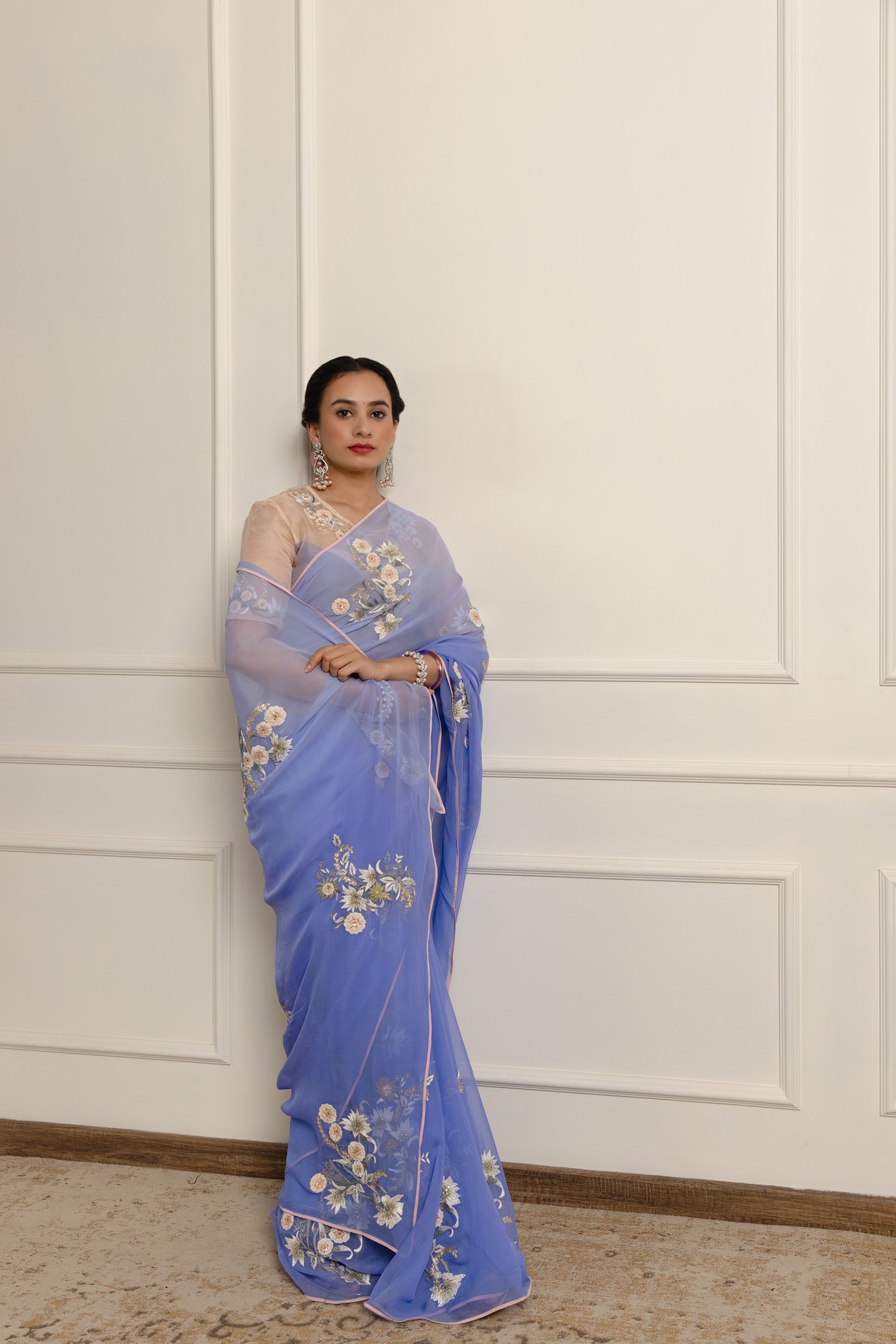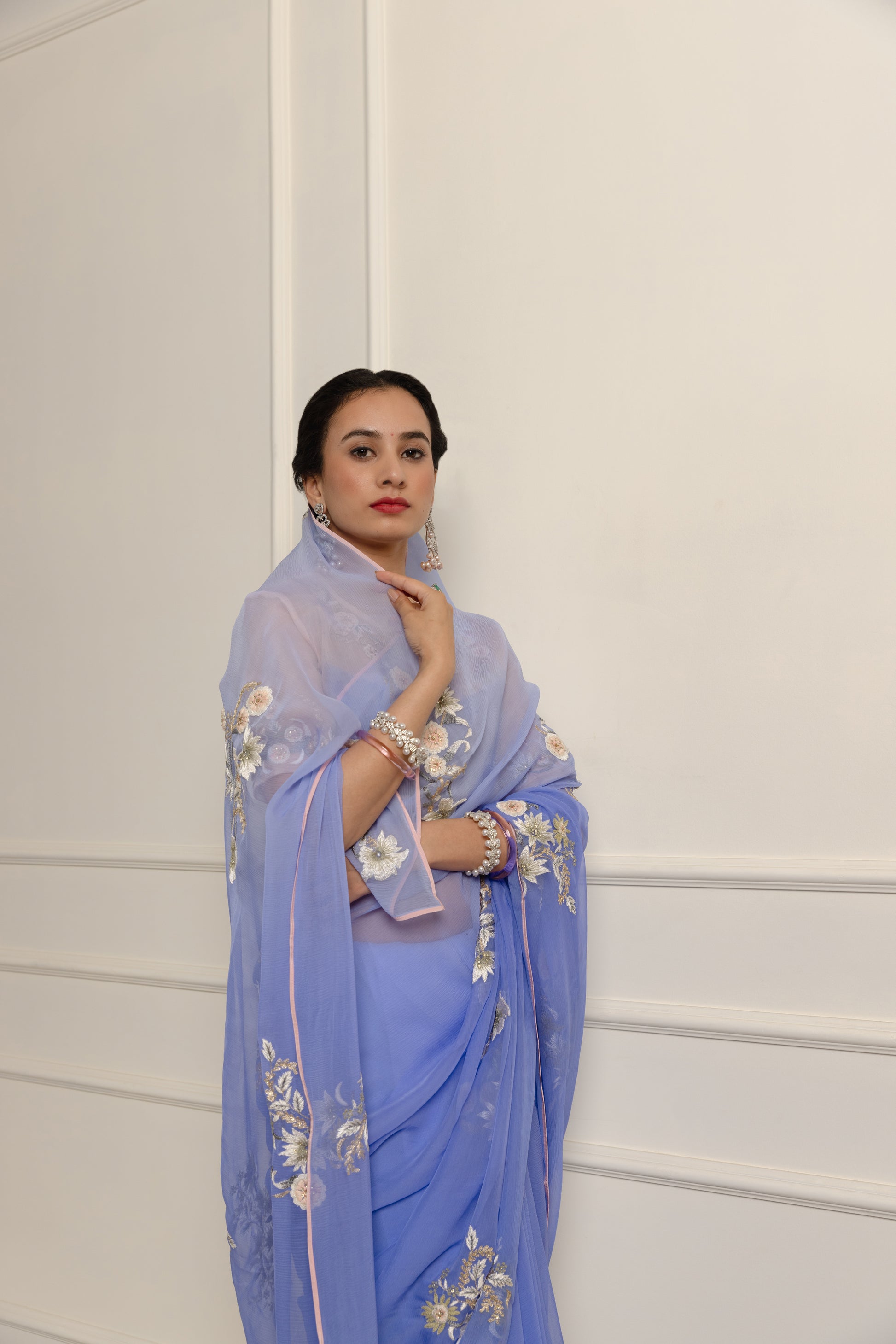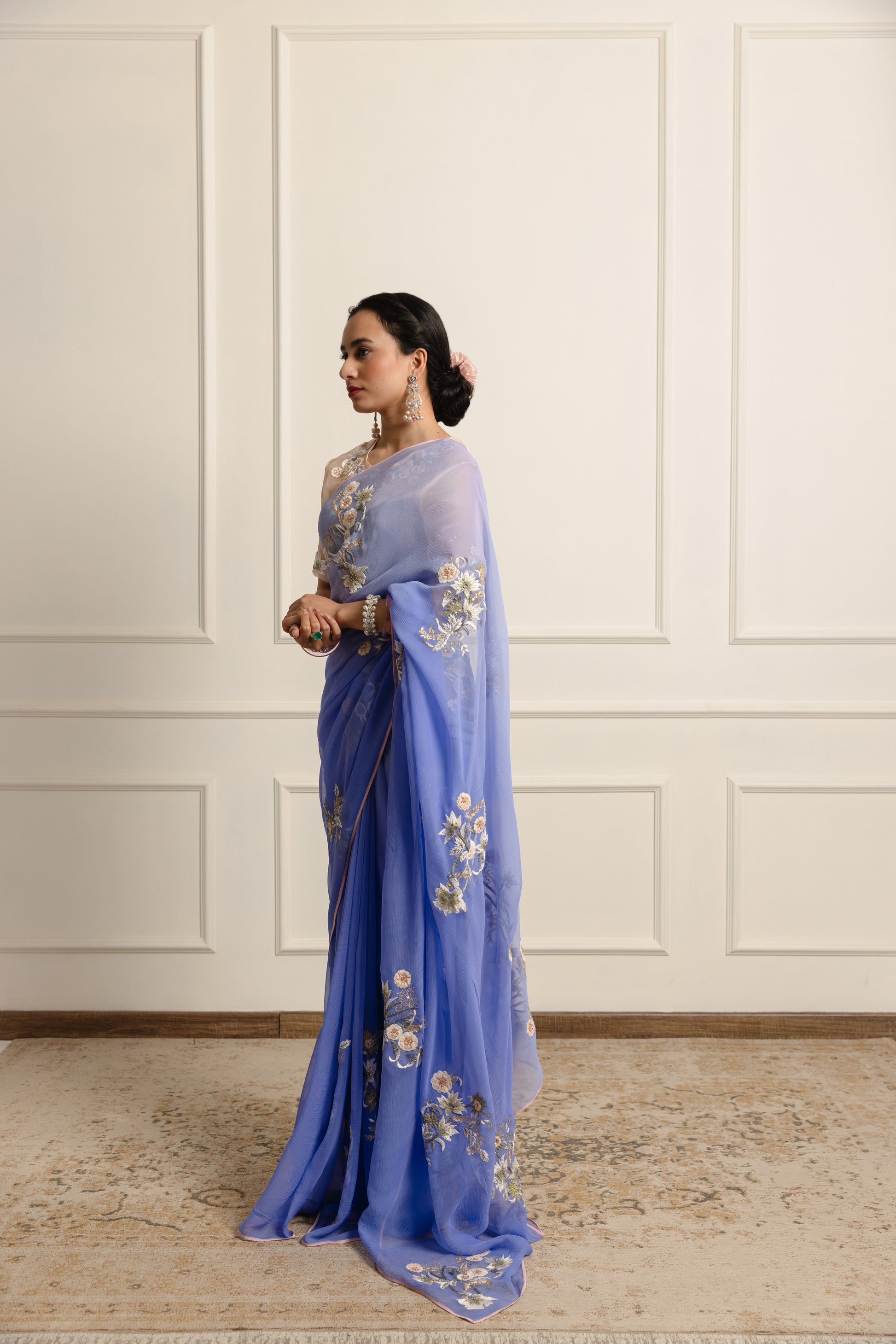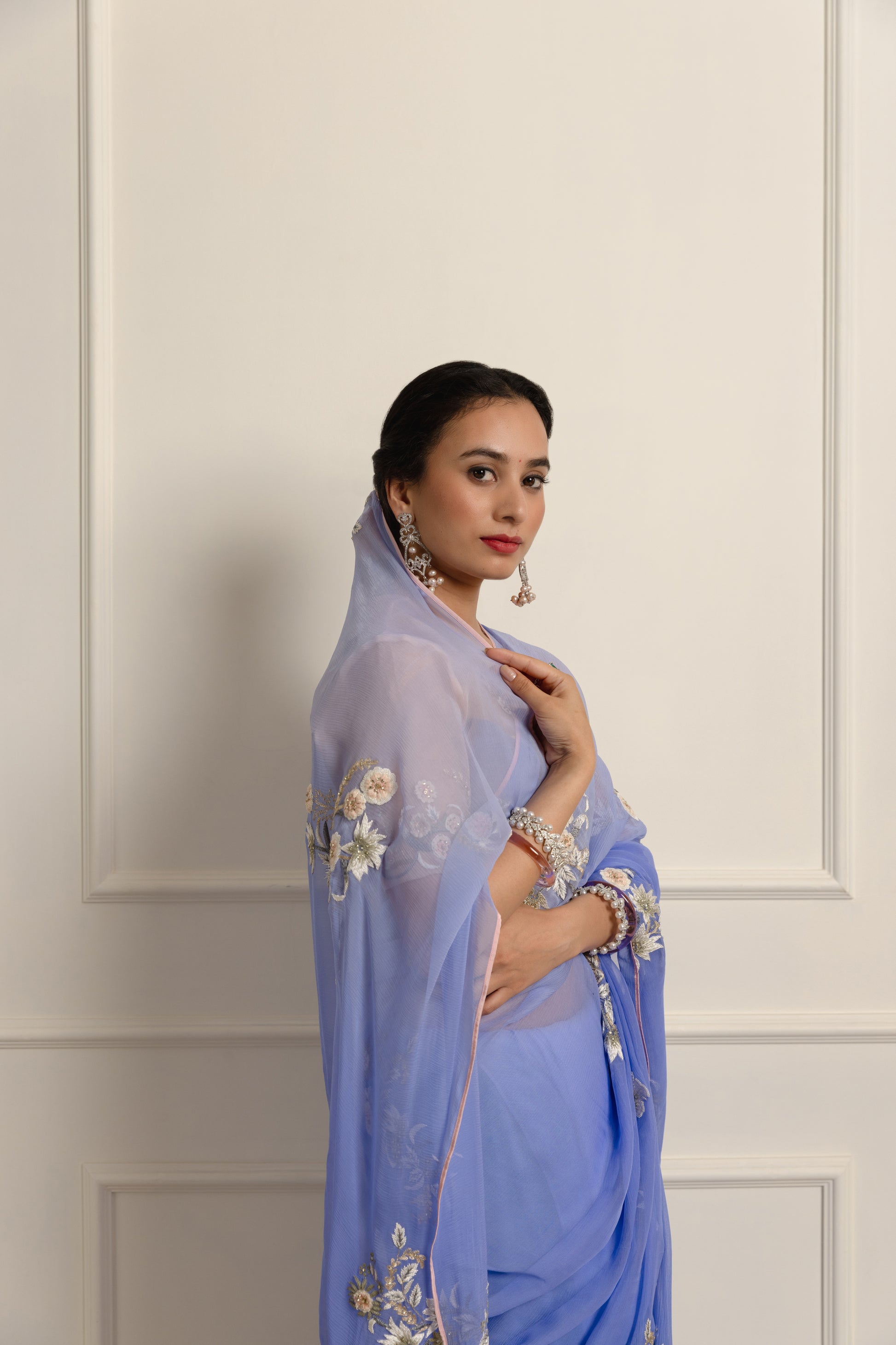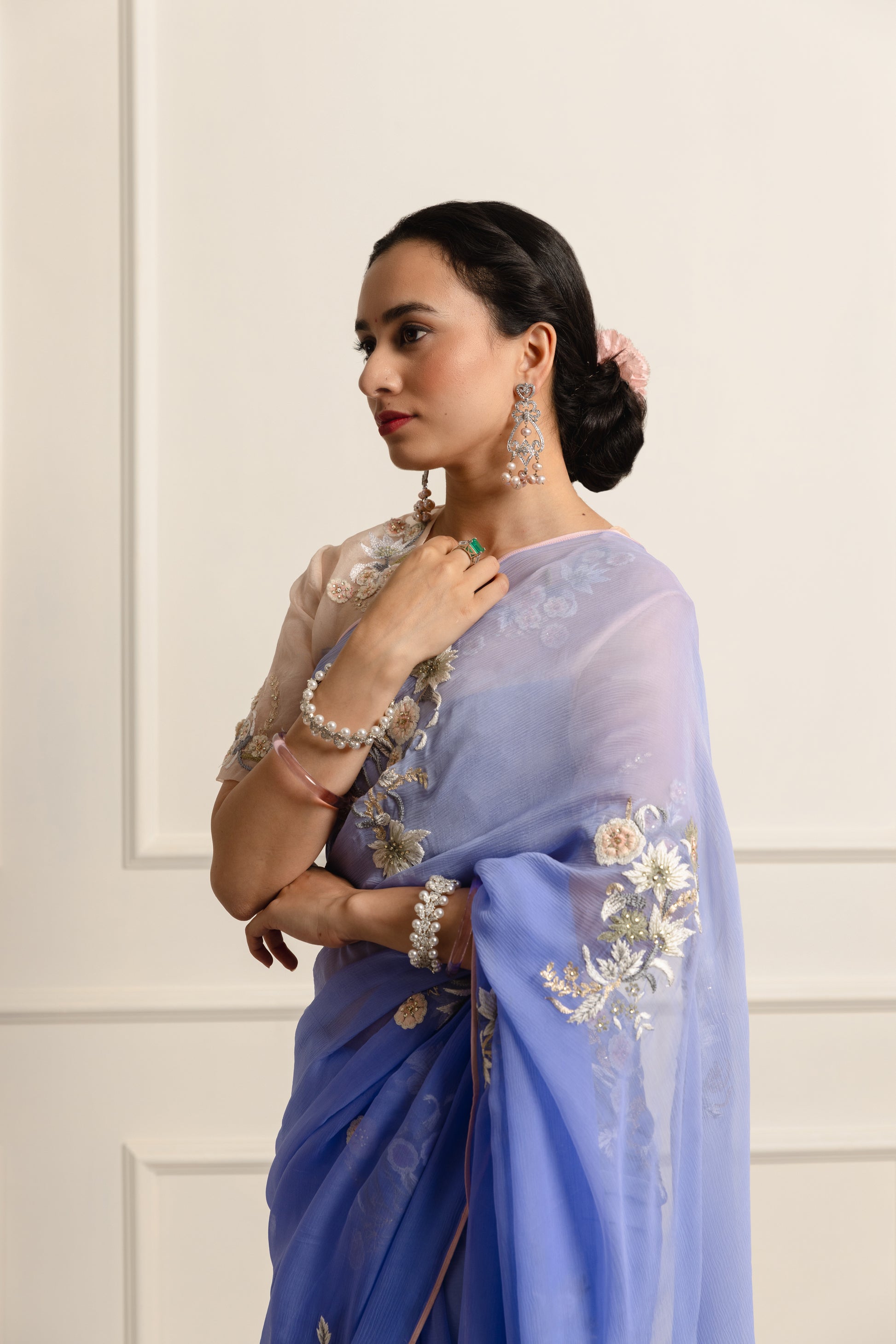 Ombre Periwrinkle Chiffon saree embroidered in antique silk floss and Swarovski crystal in a Baroque motif design , paired with an embroidered organza blouse finished with a satin piping.