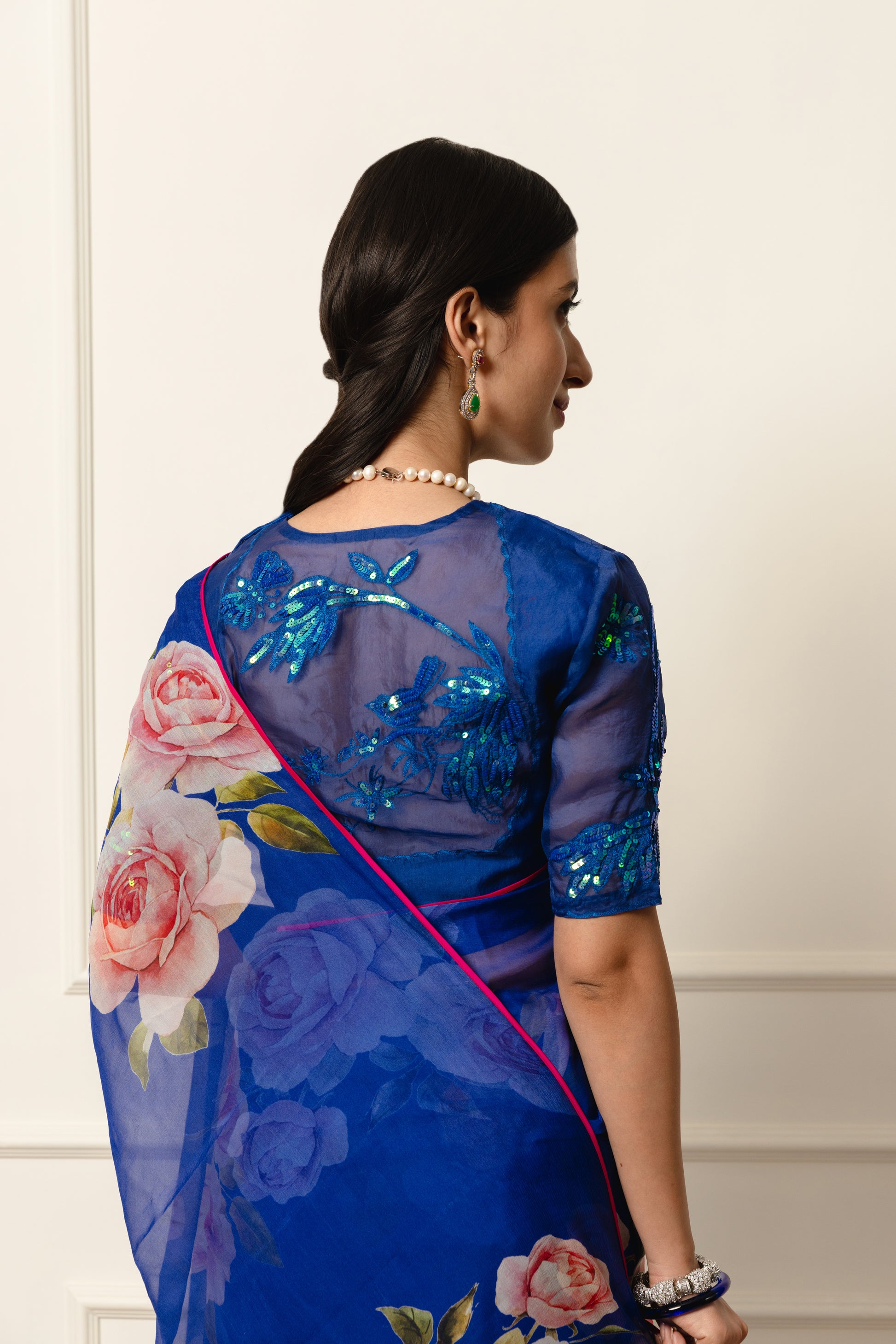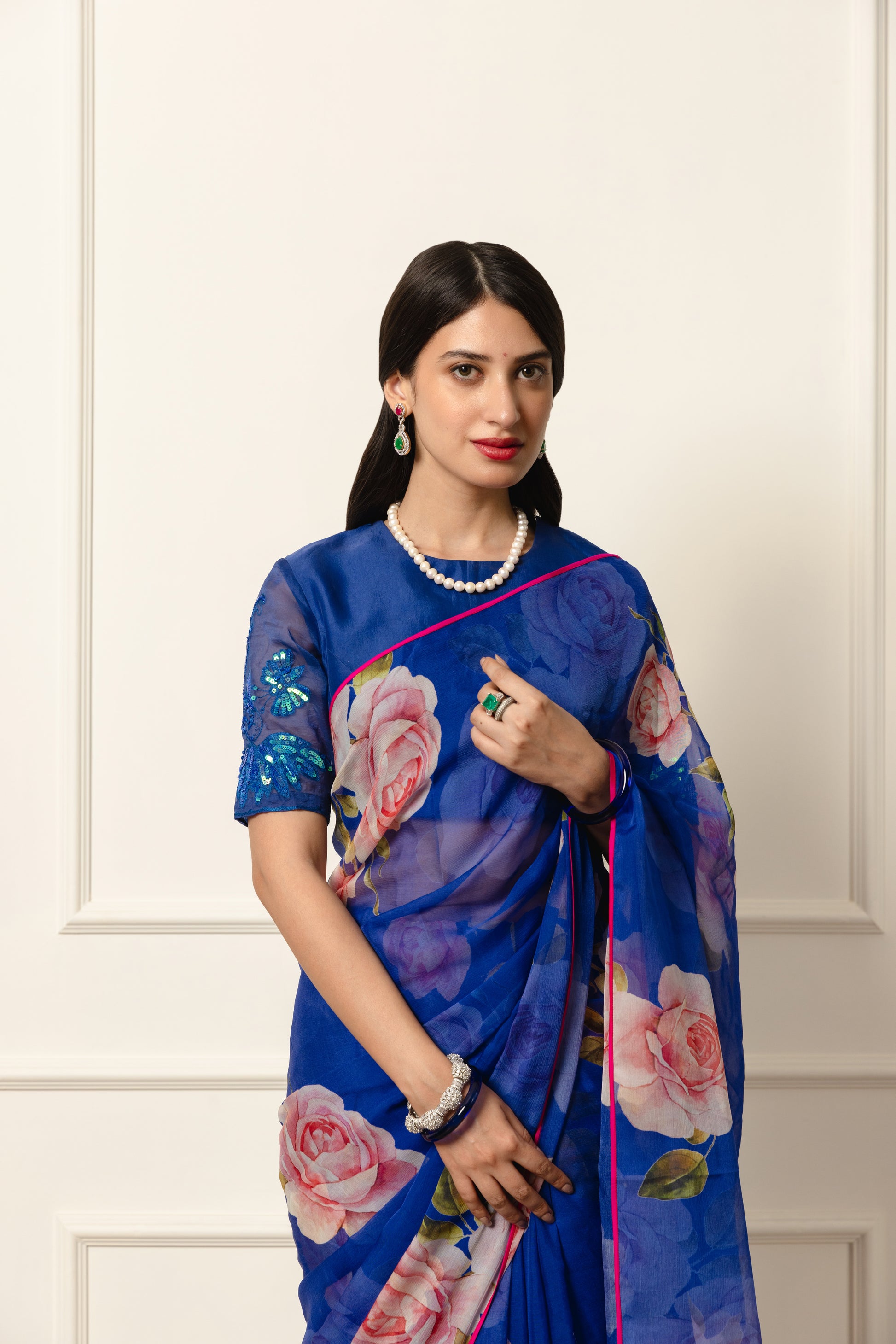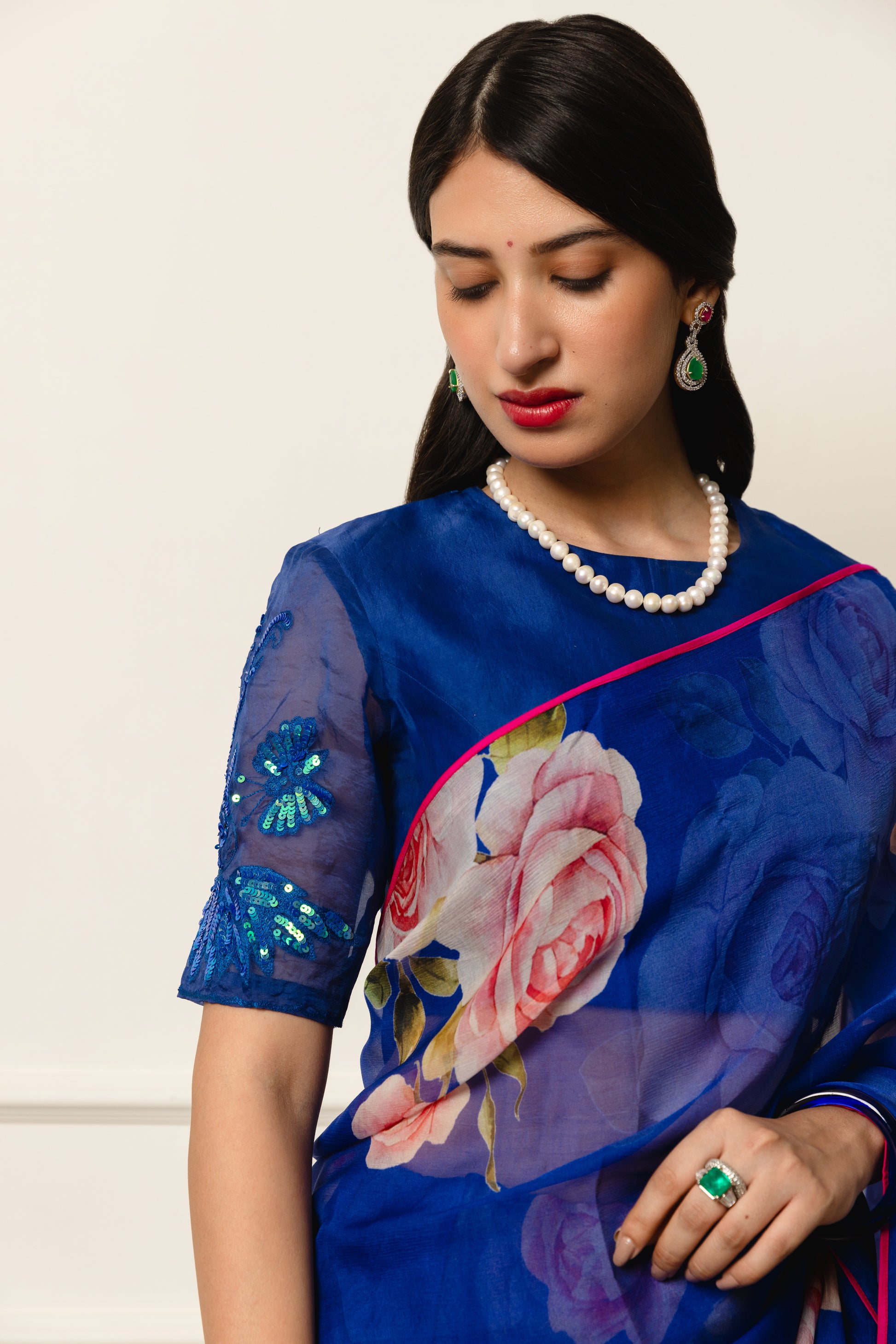 Printed French chiffon saree with a matching embroidered silk organza blouse piece.