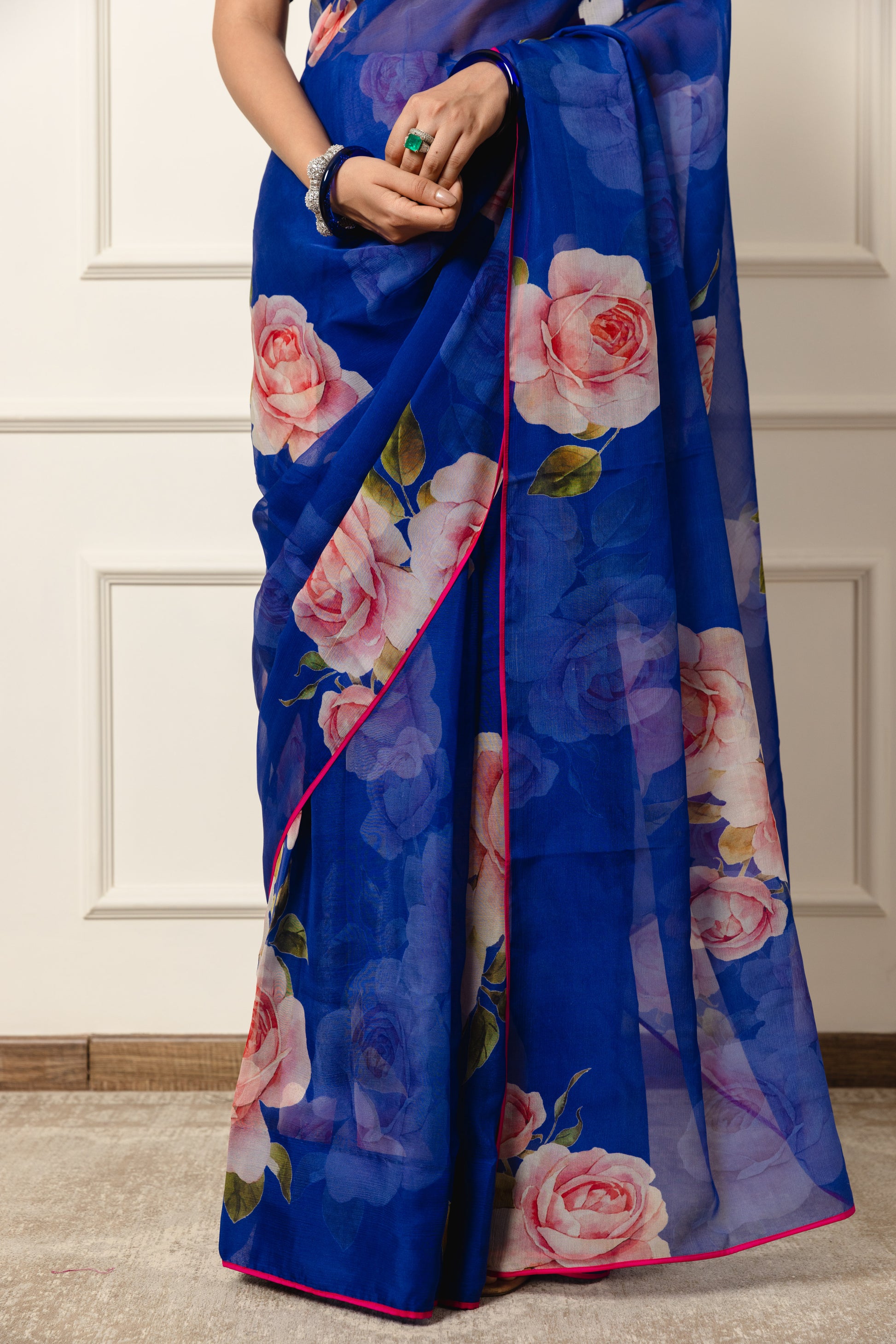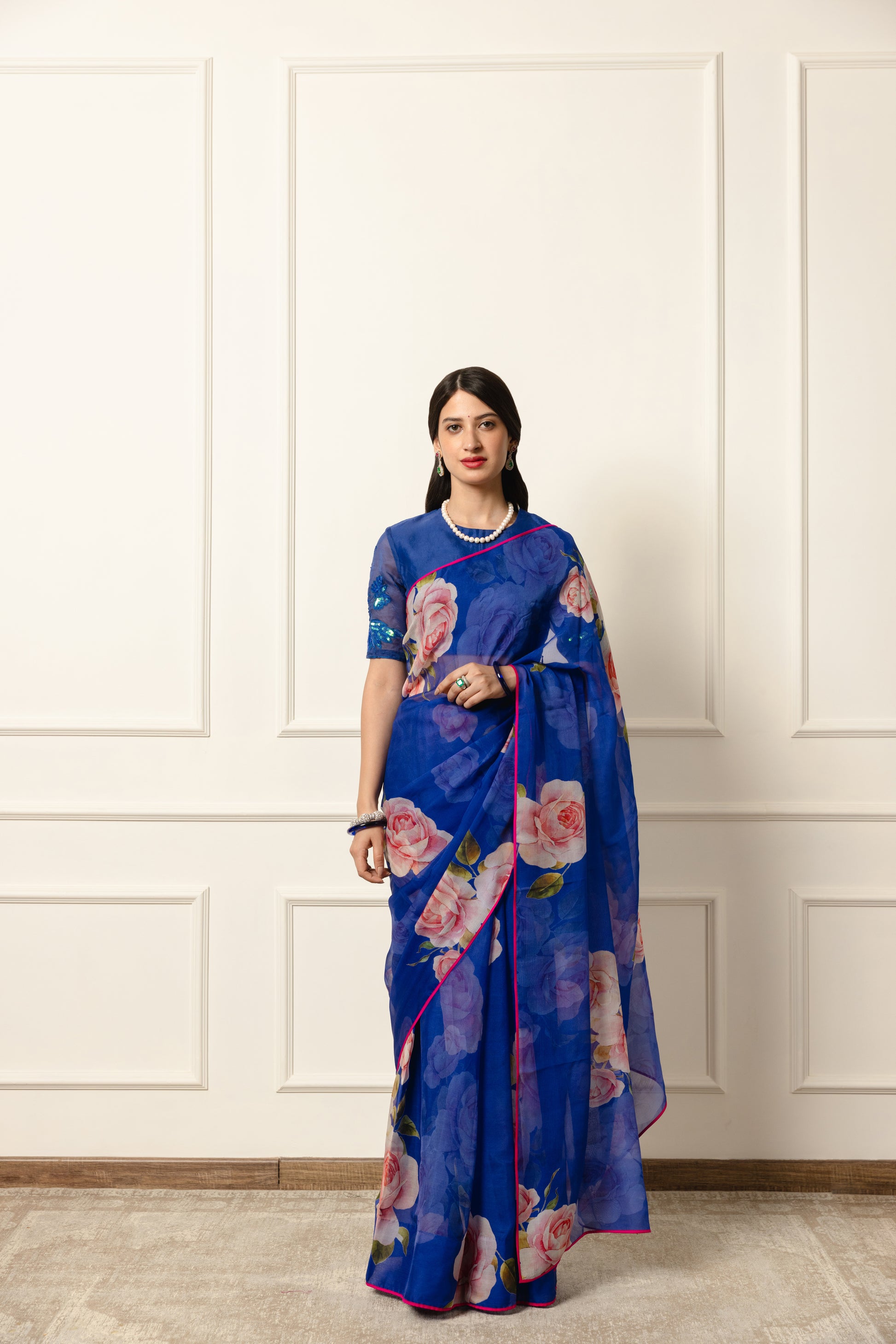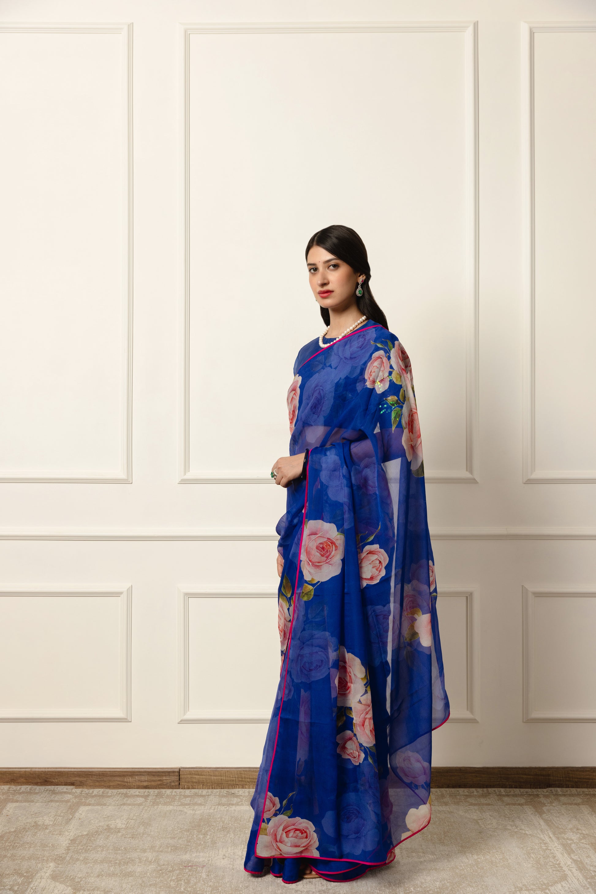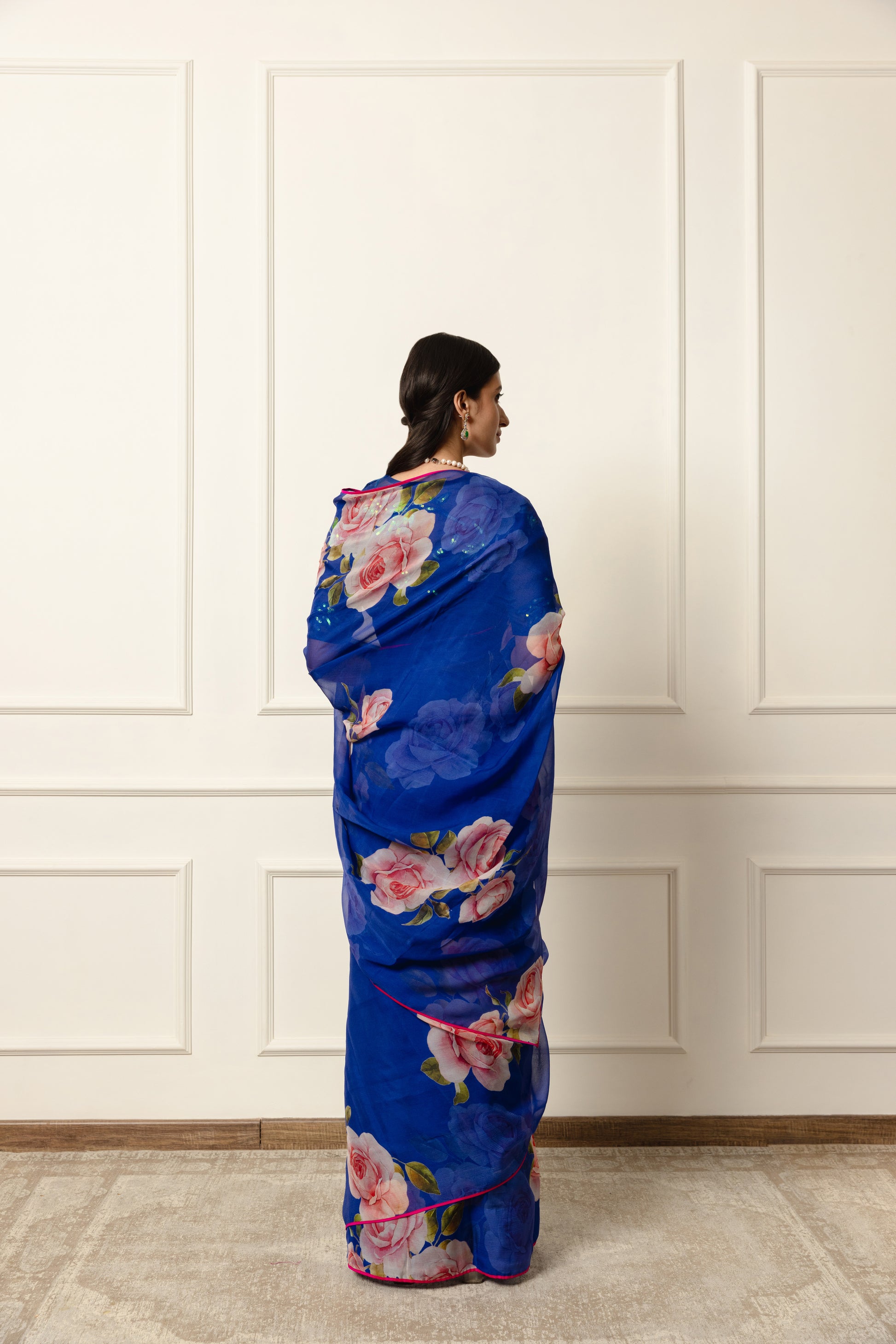 Printed French chiffon saree with a matching embroidered silk organza blouse piece.