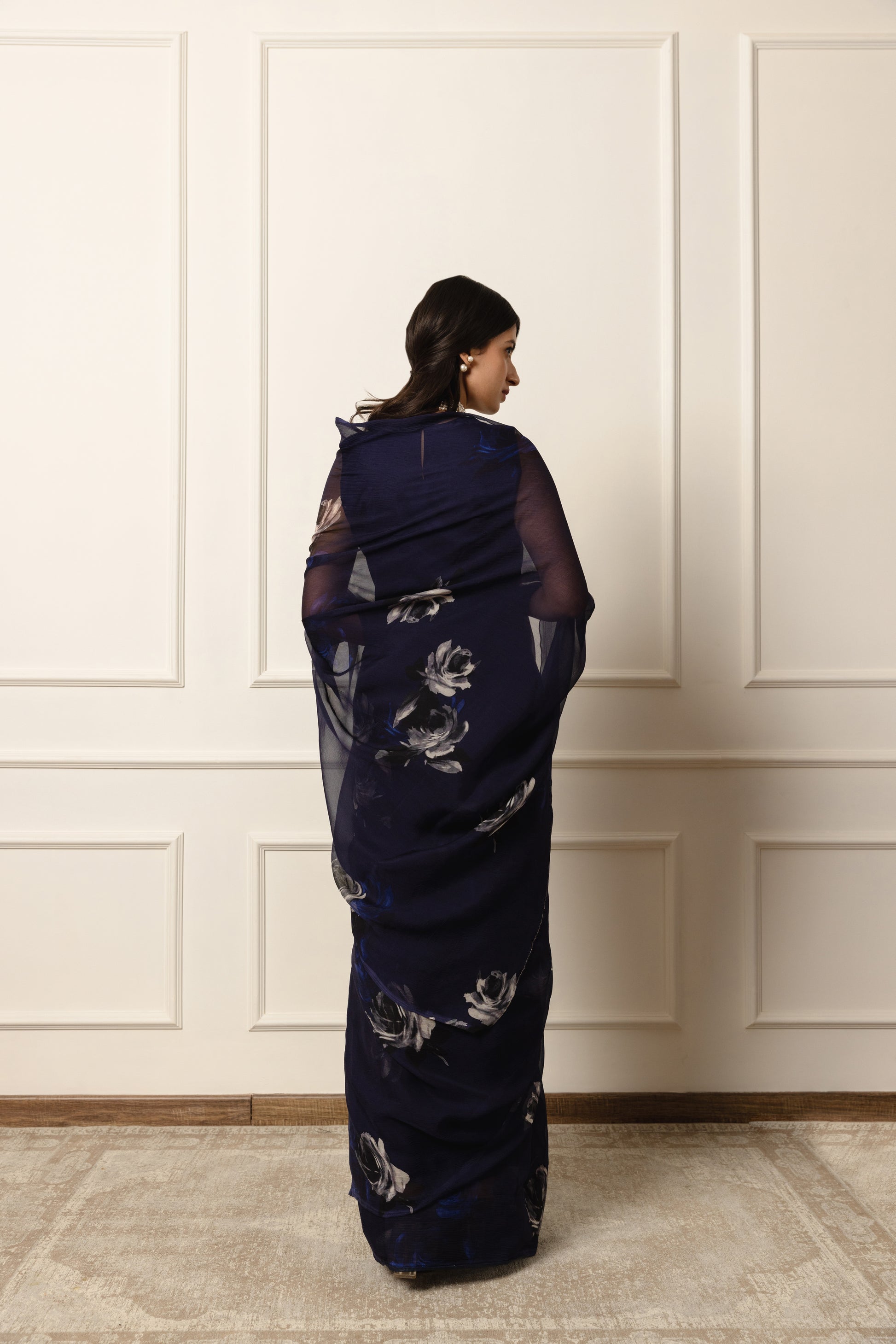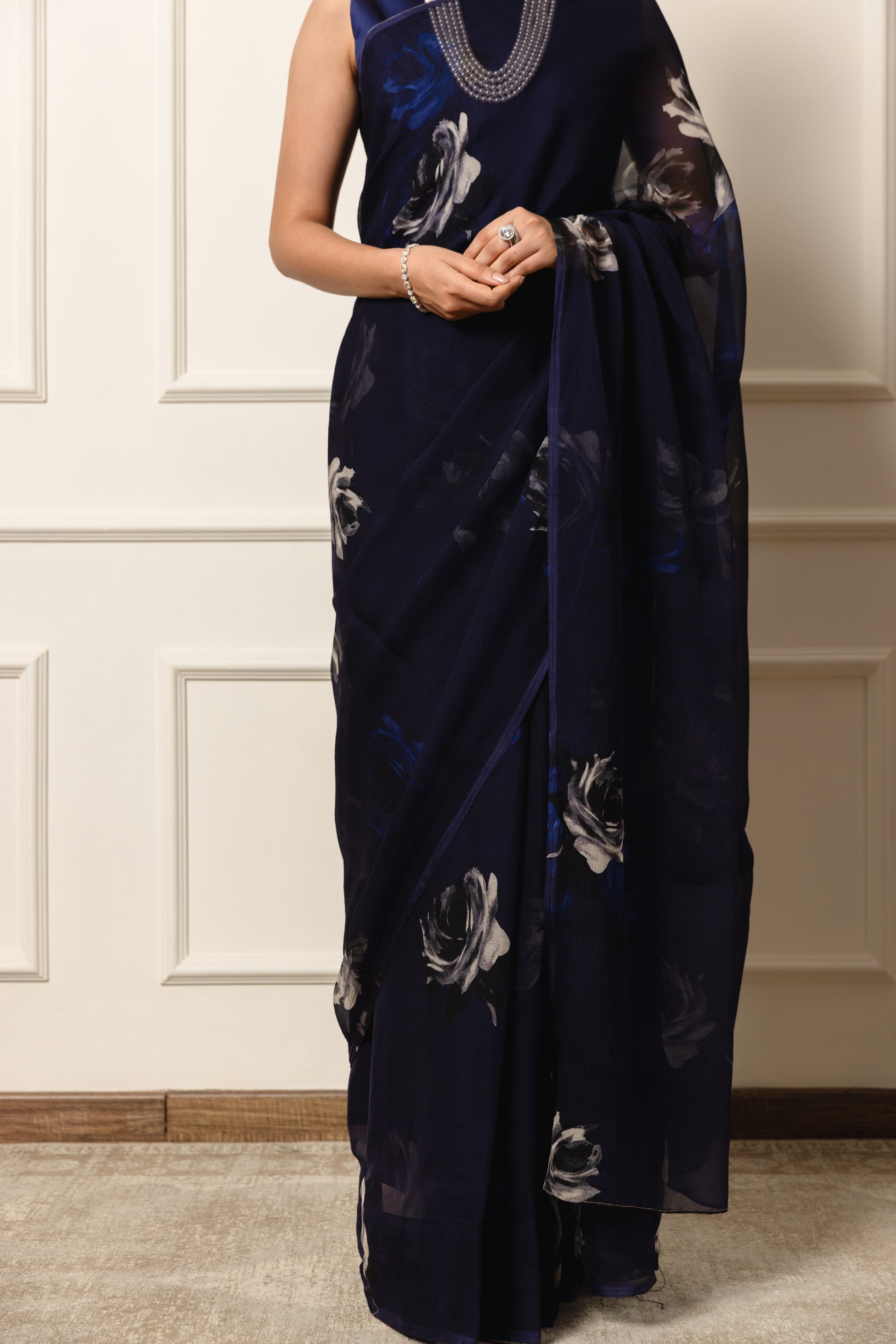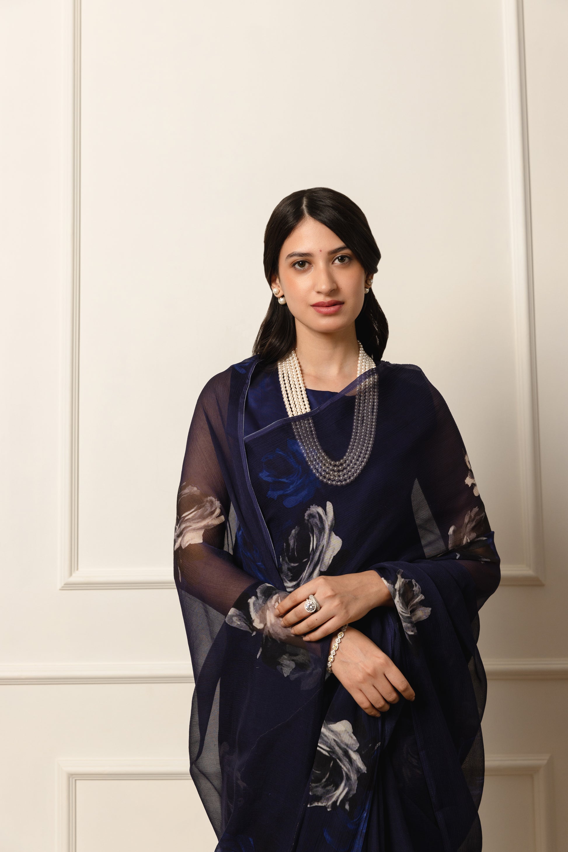 Printed French chiffon saree with a matching silk satin blouse piece.