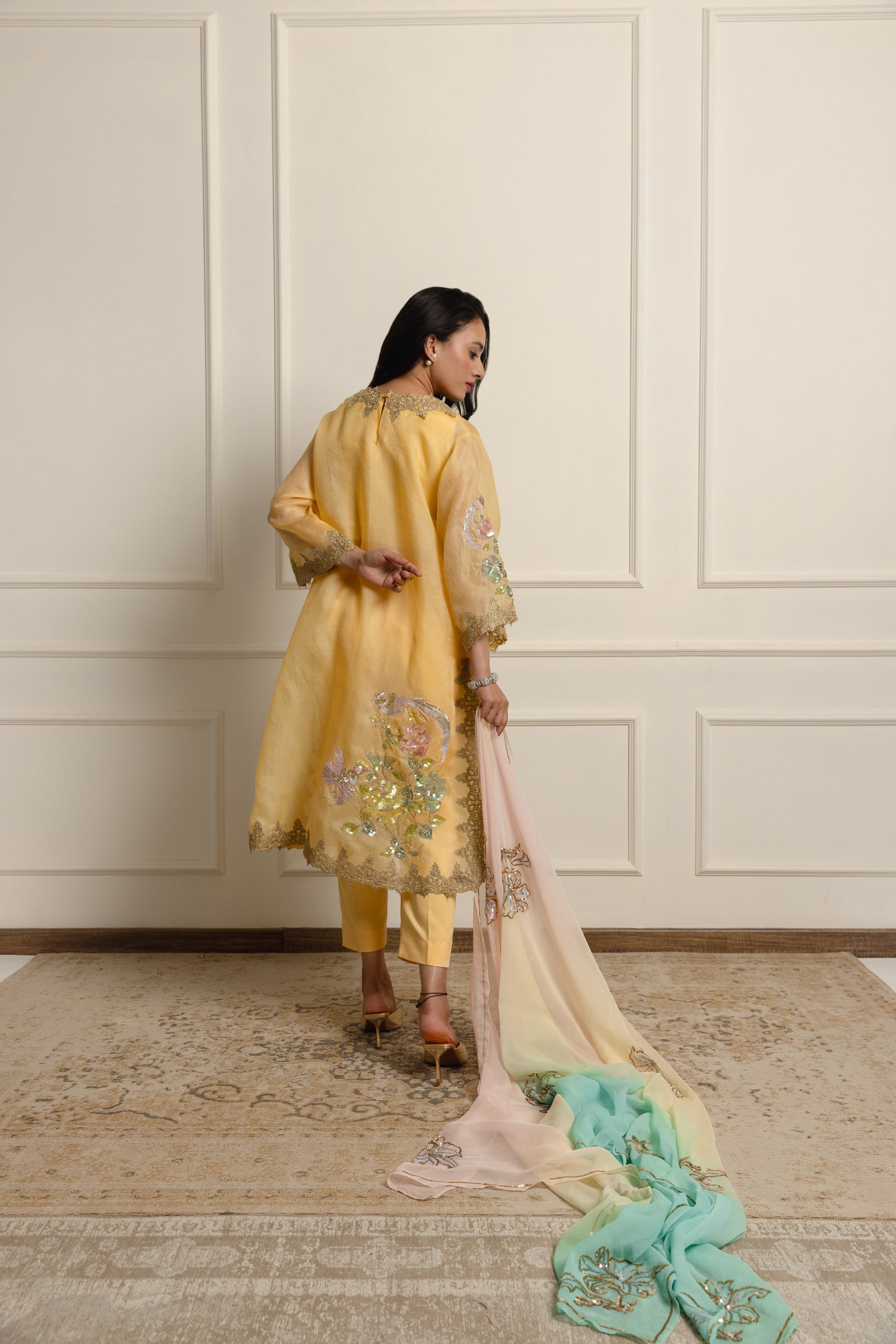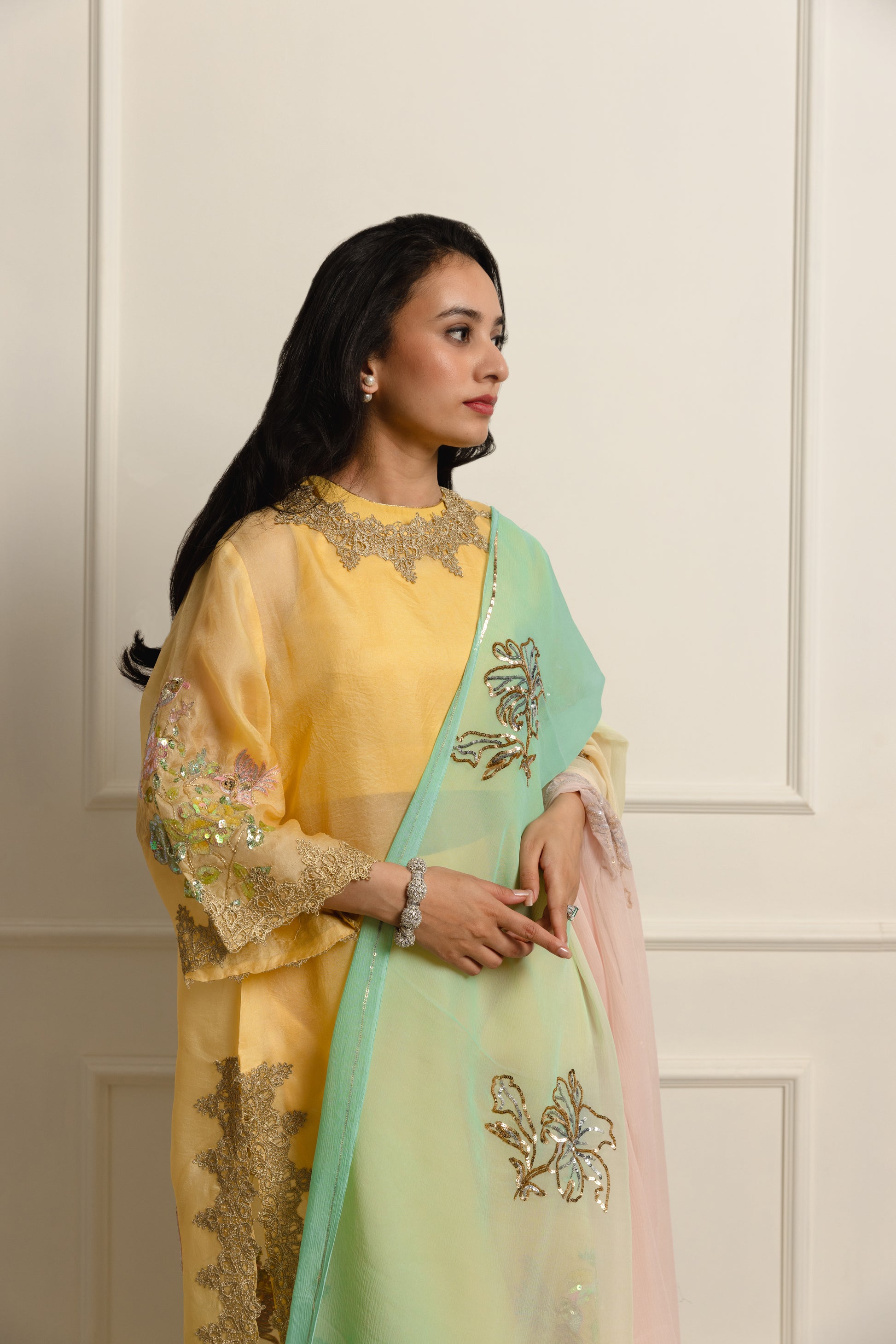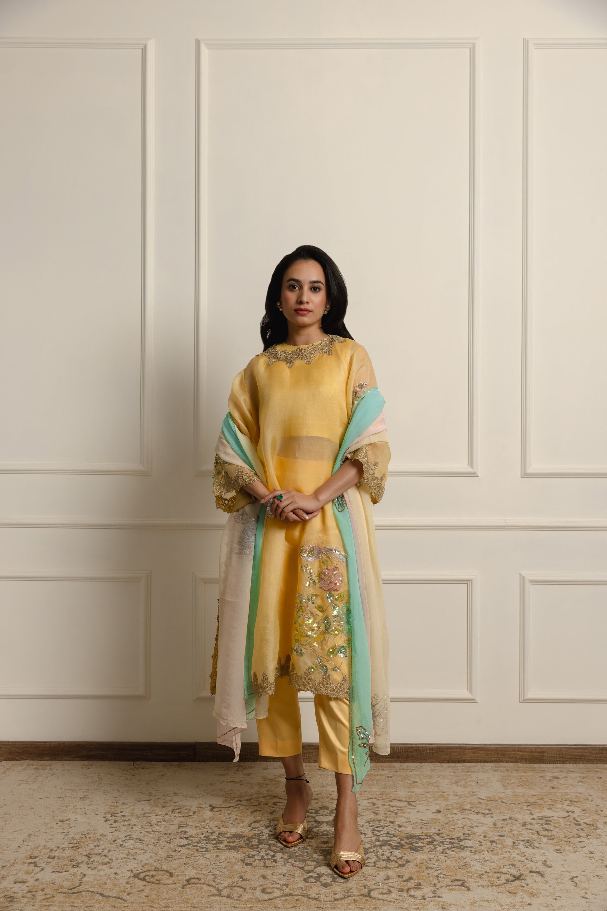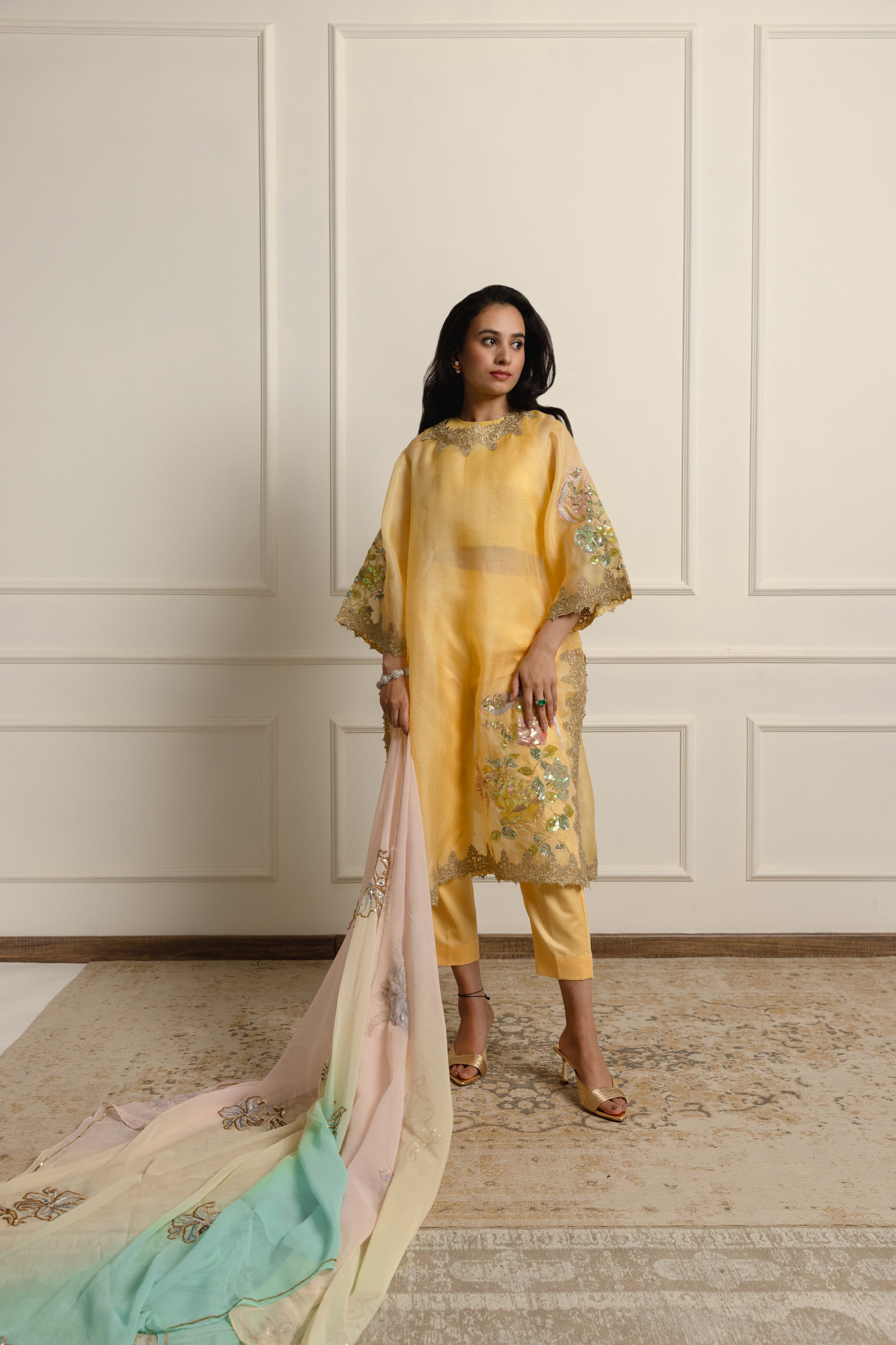 - Fabric - Kurta- Silk Organza, Pant- Silk Satin, Dupatta - Silk Chiffon