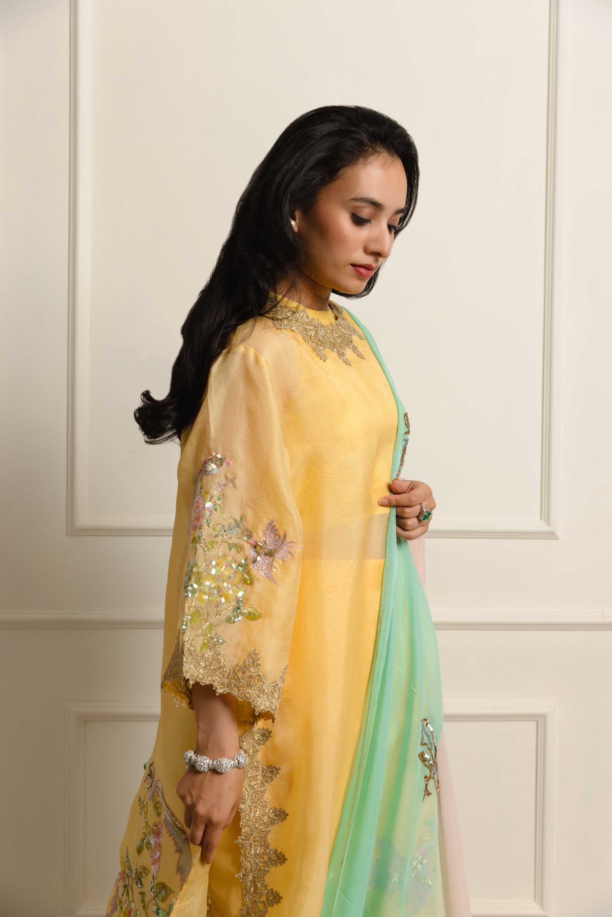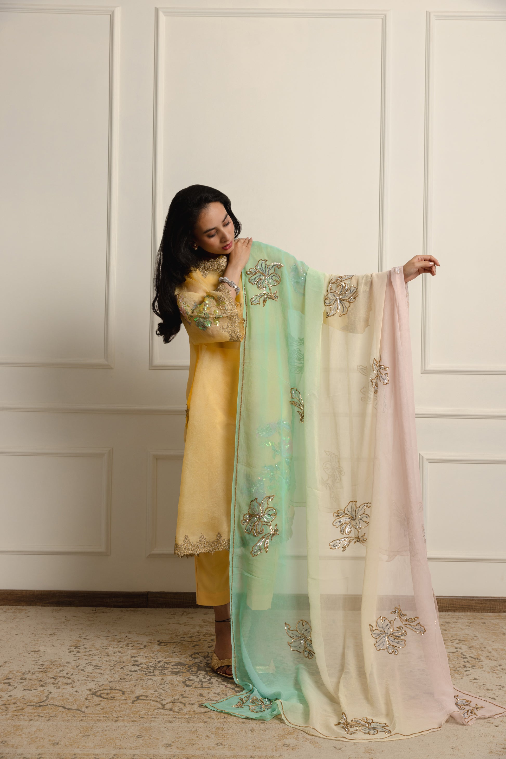 Double organza shirt embroidered with shell sequins and gold chantilly lace , paired with satin pants , and ombre chiffon odhni embroidered with sequins and crystals.