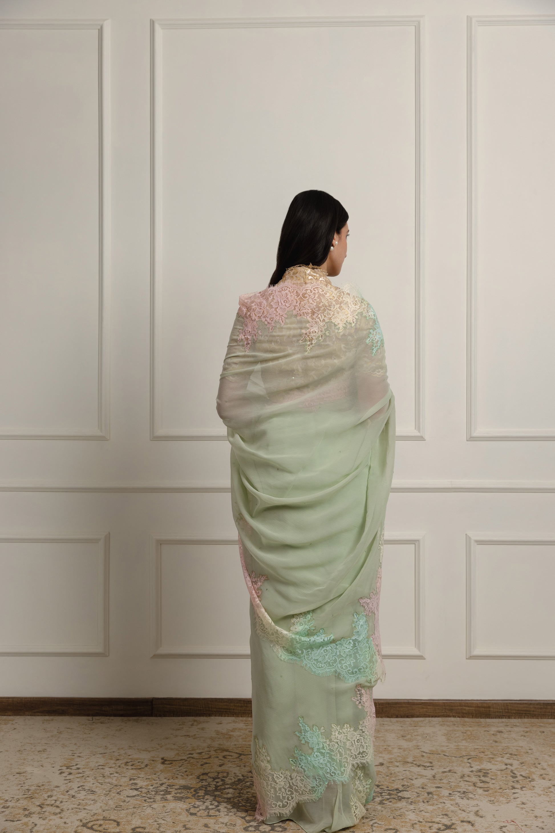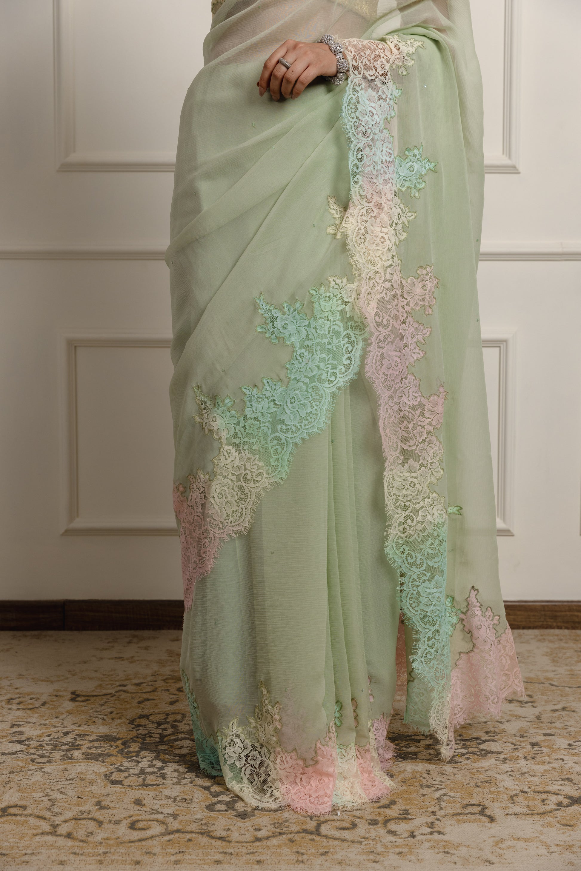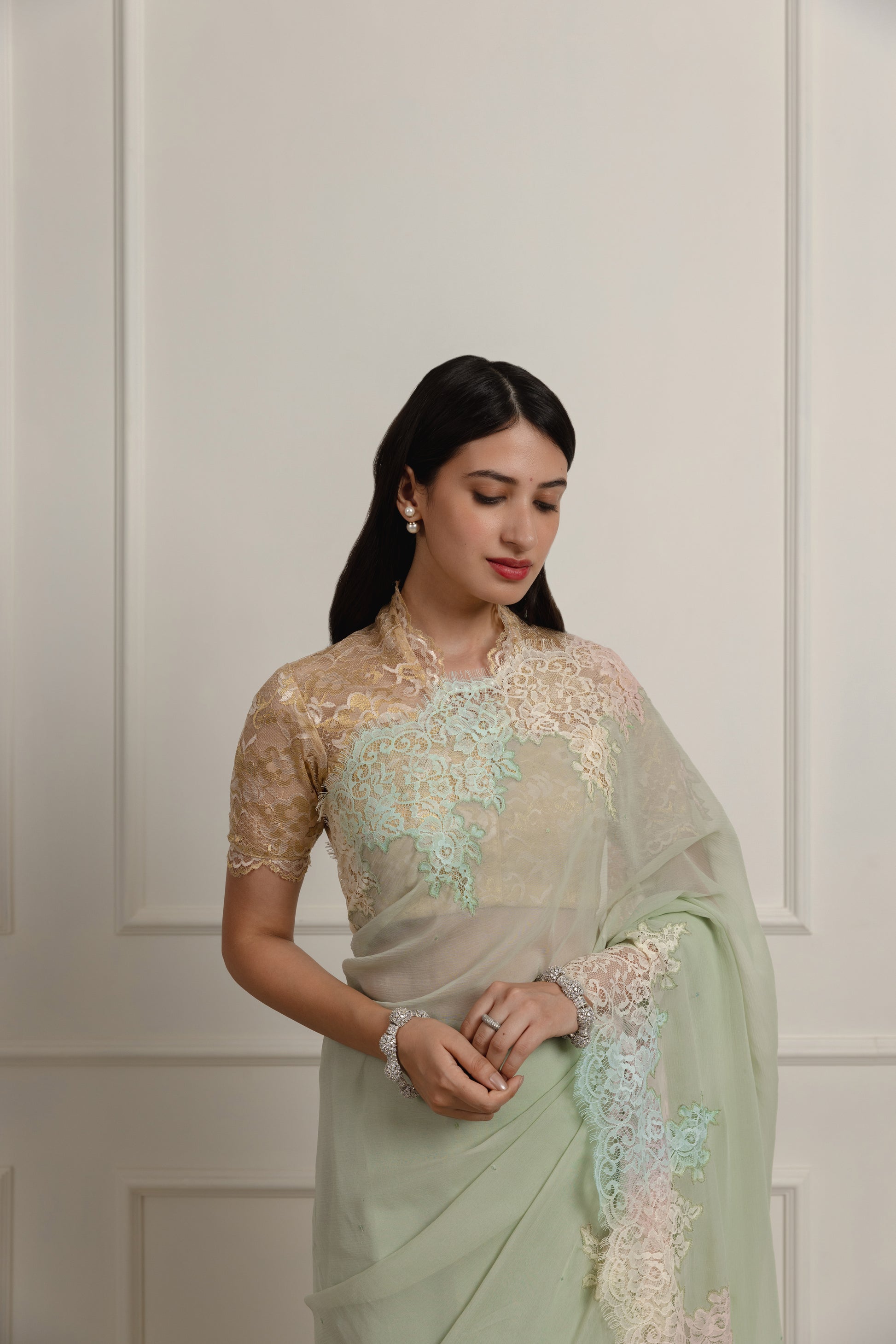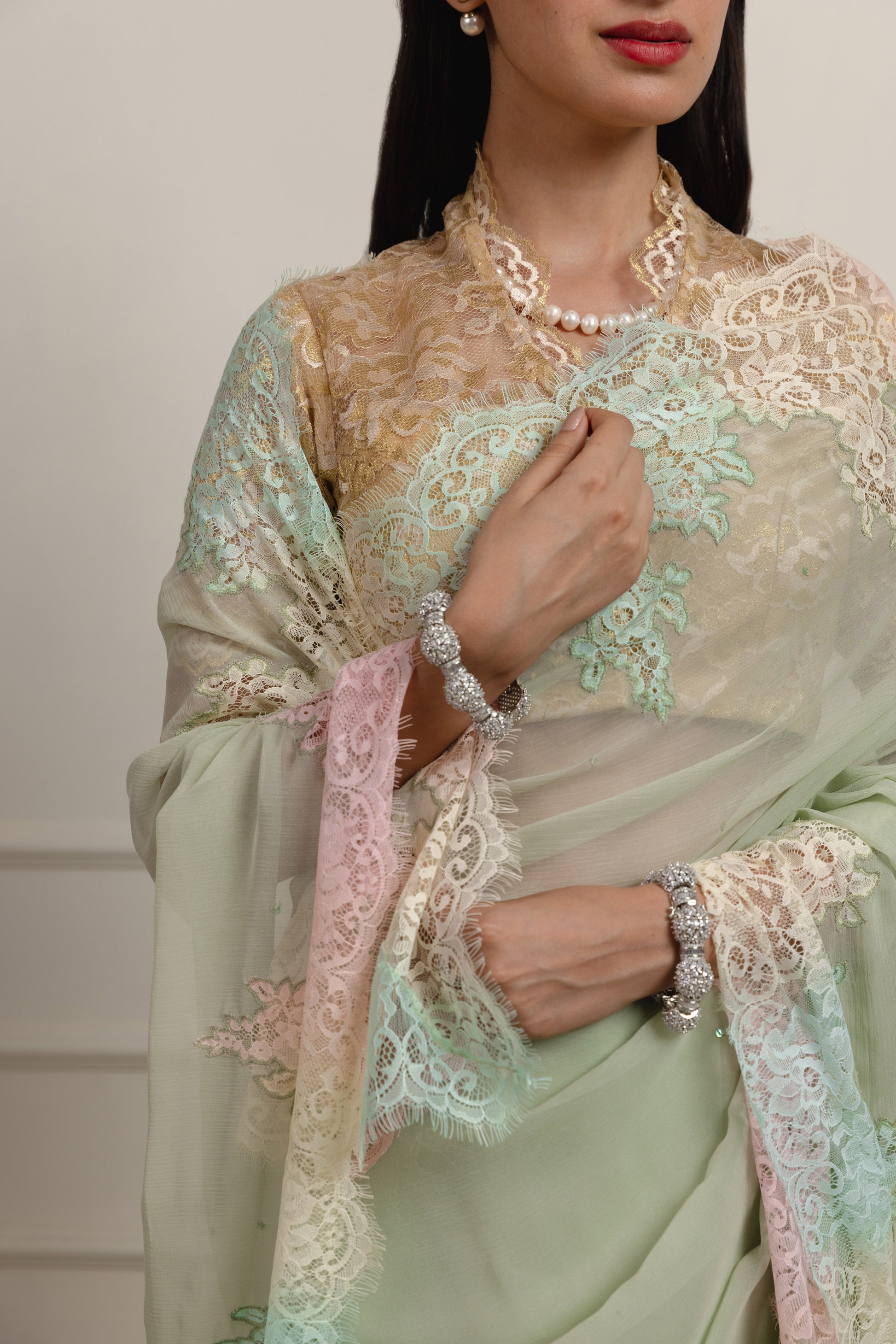 Soft sage green chiffon accentuated with silk Chantilly lace in classic Antoinette colours aqua, butter and pink . Paired with a gold chantilly blouse.