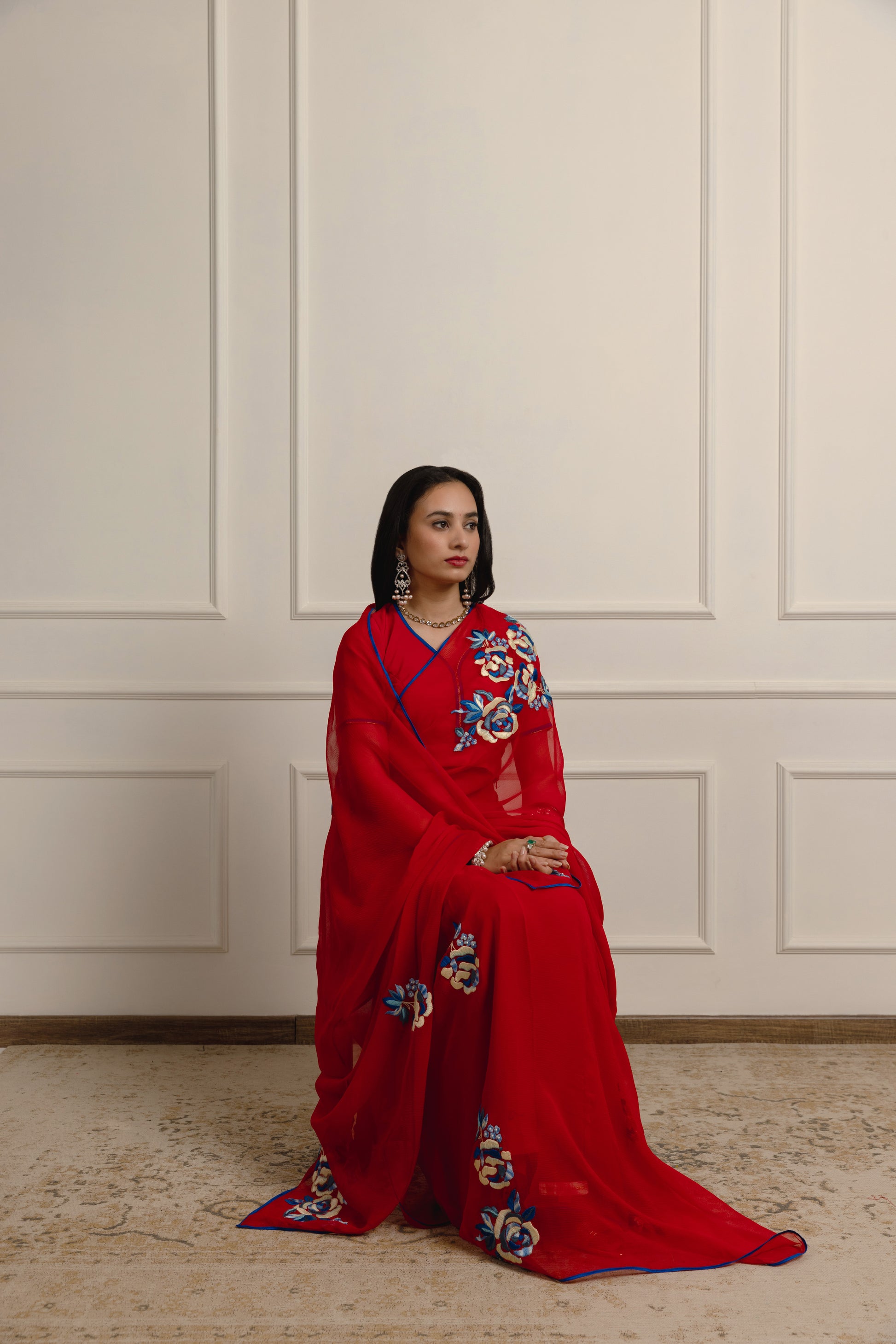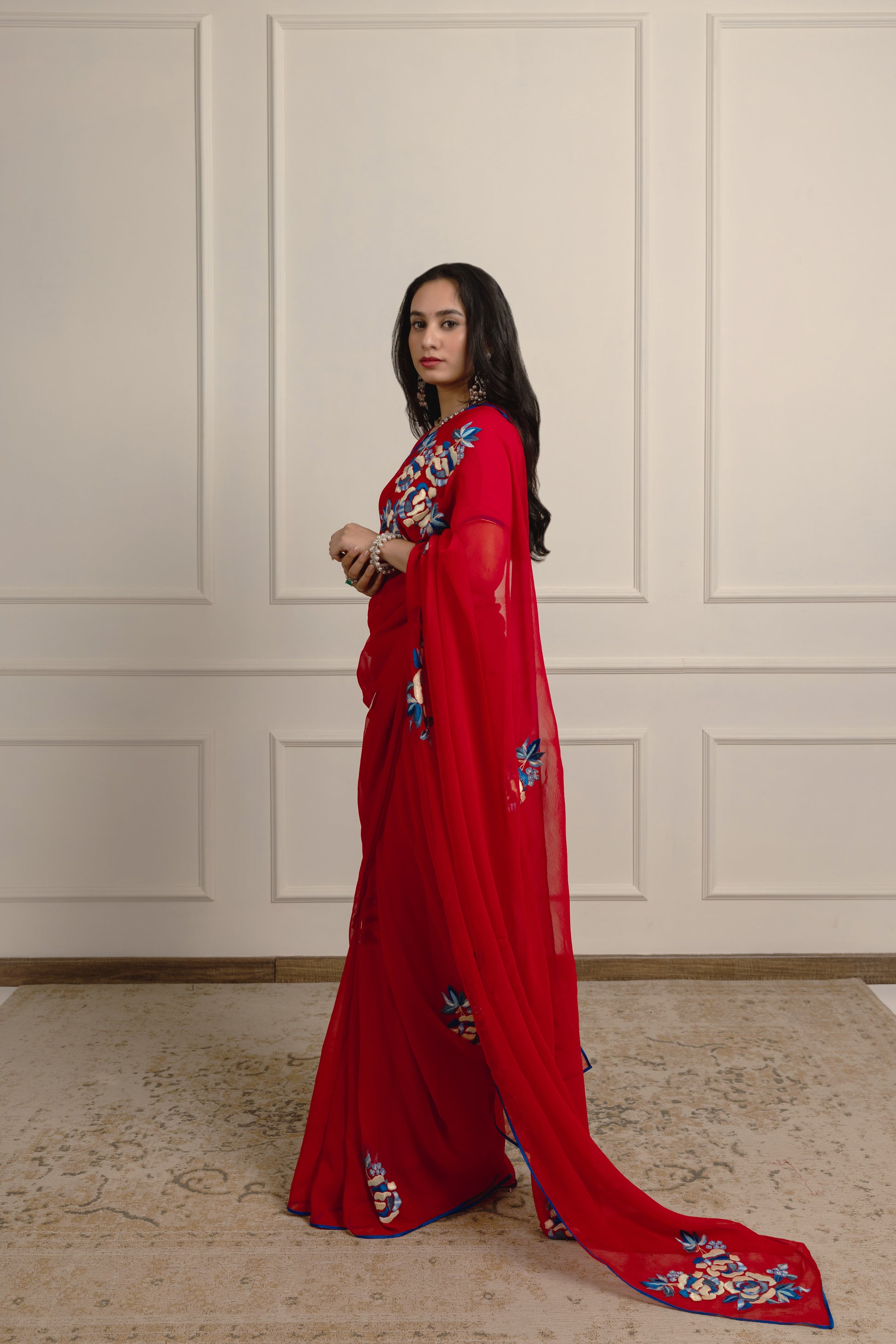 Harshini Red chiffon embroidered with Silk floss embroidered China flowers, finished with a complimenting blue satin piping and a matching satin blouse.