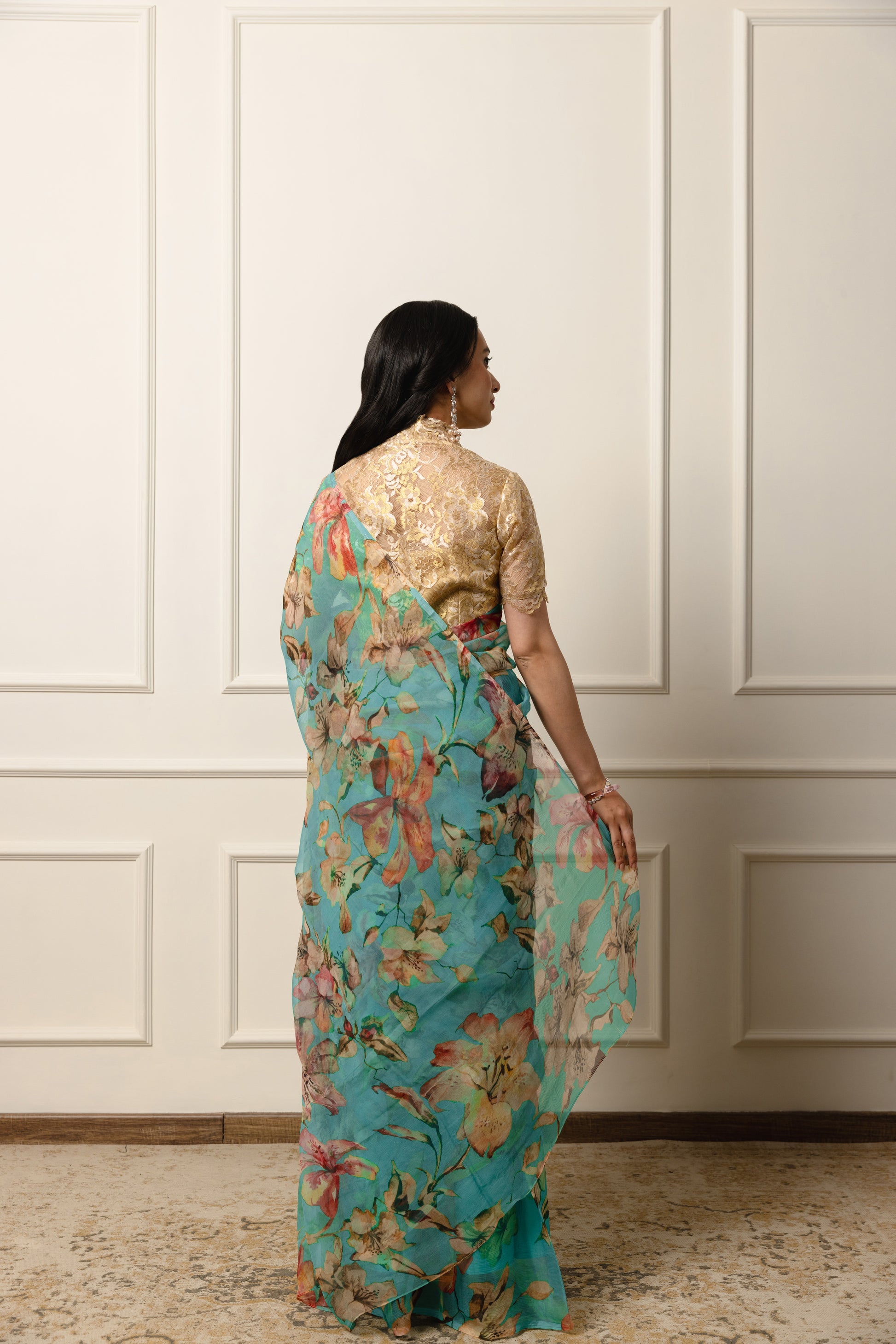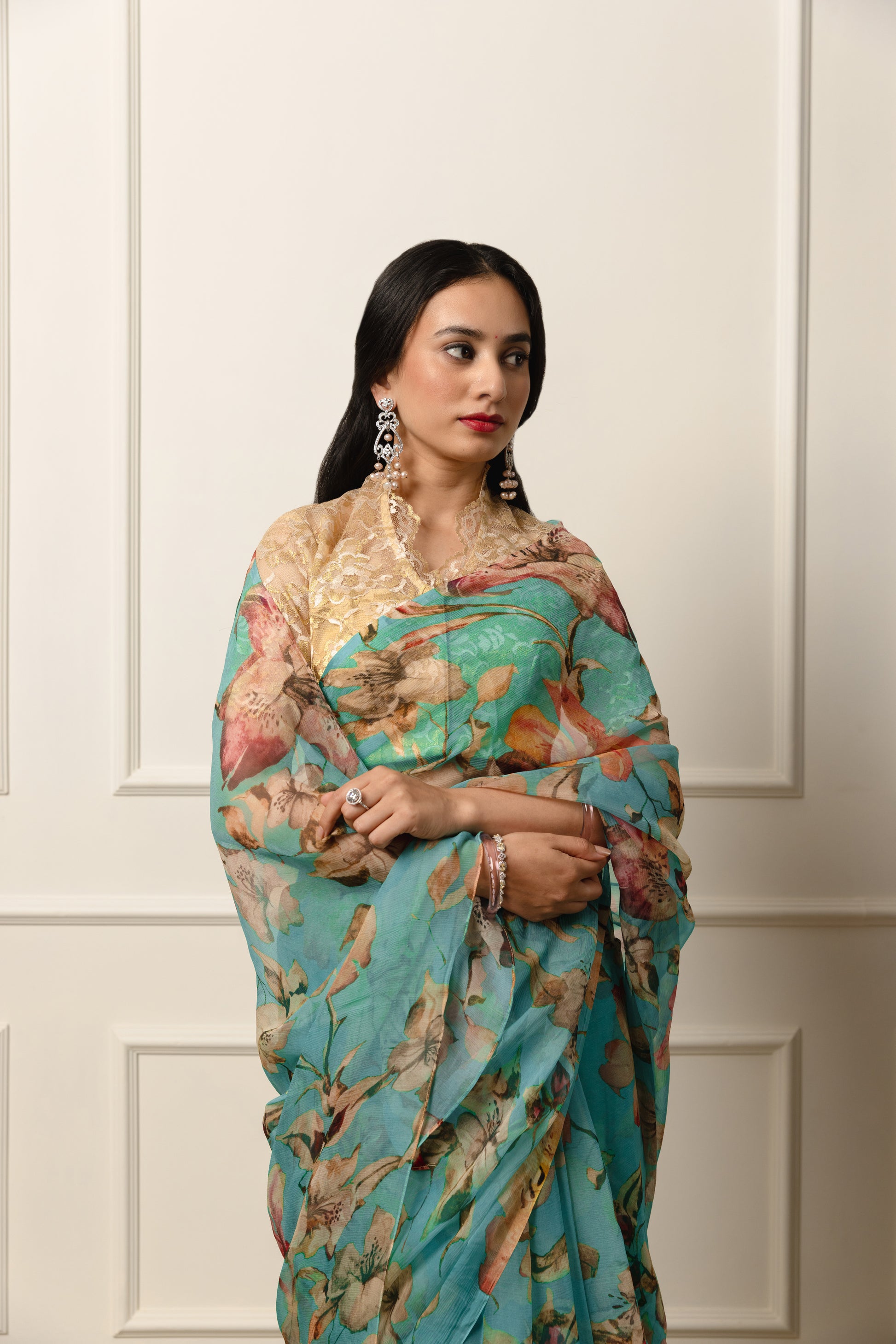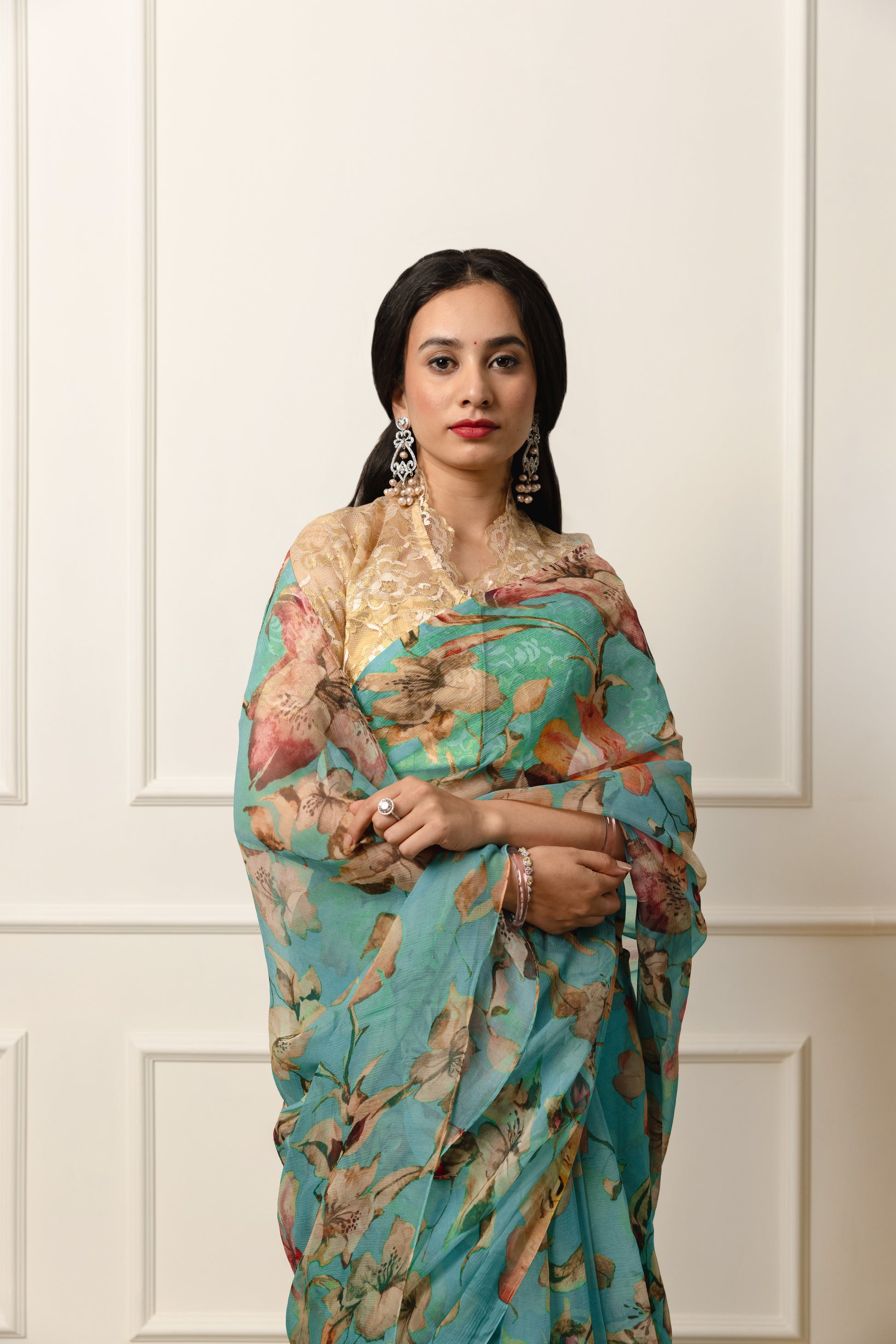 Printed French chiffon saree with a Chantilly lace blouse piece.