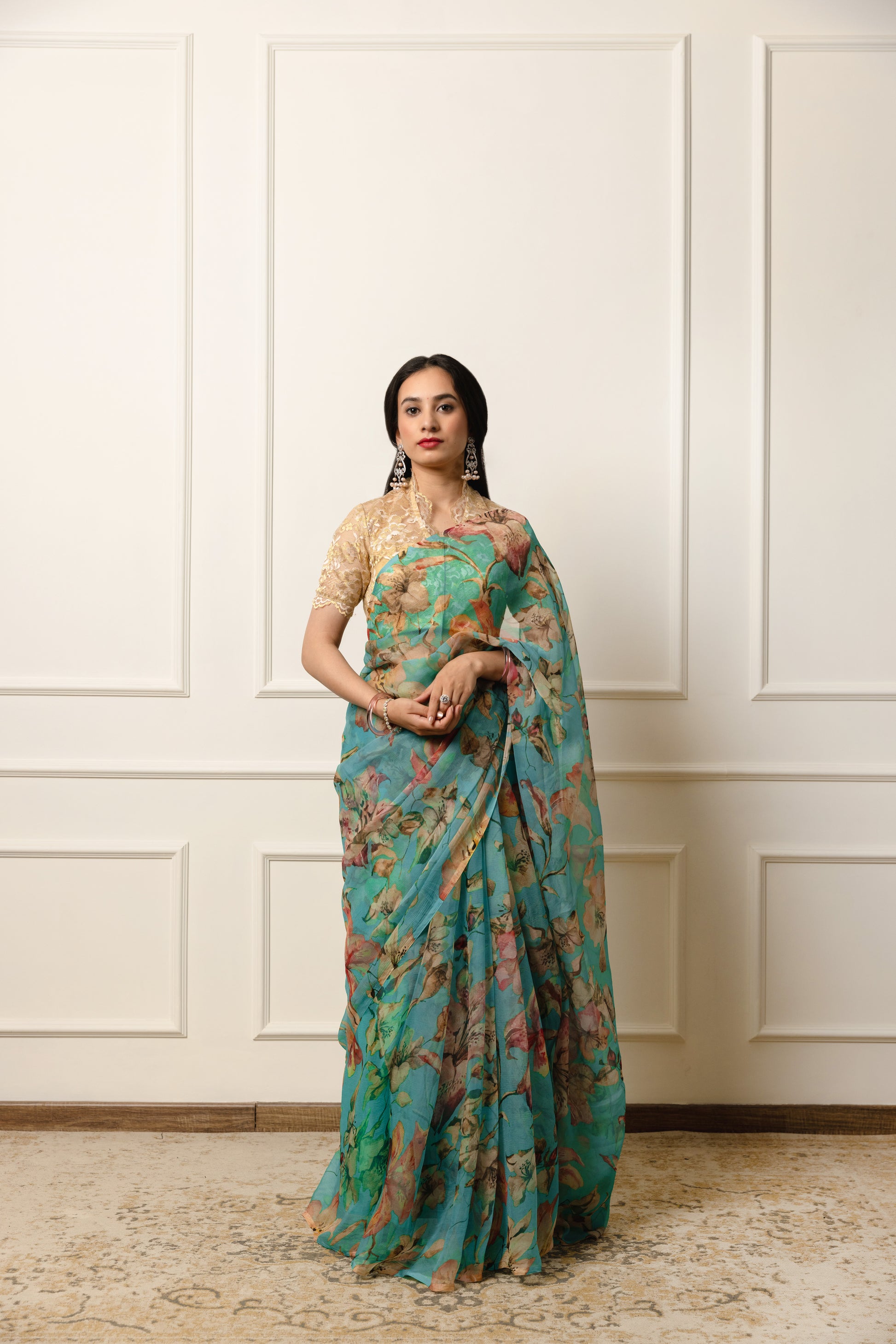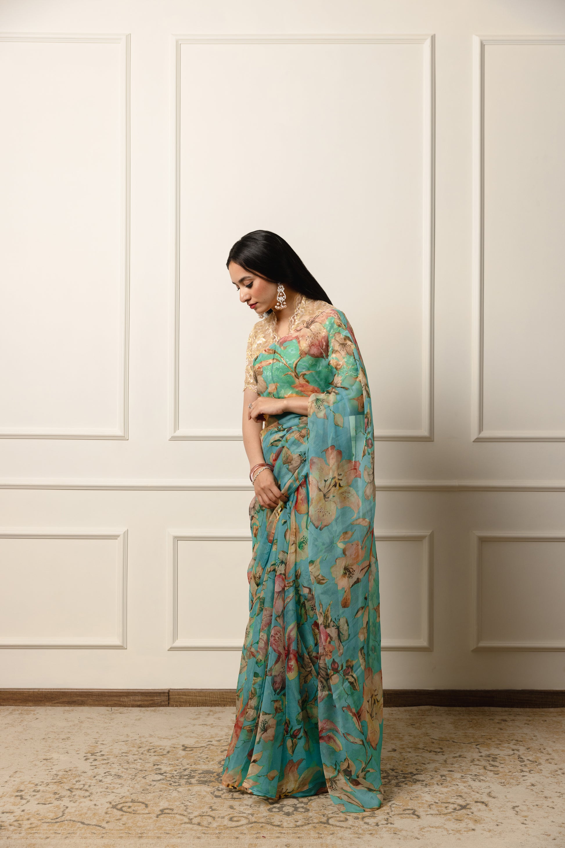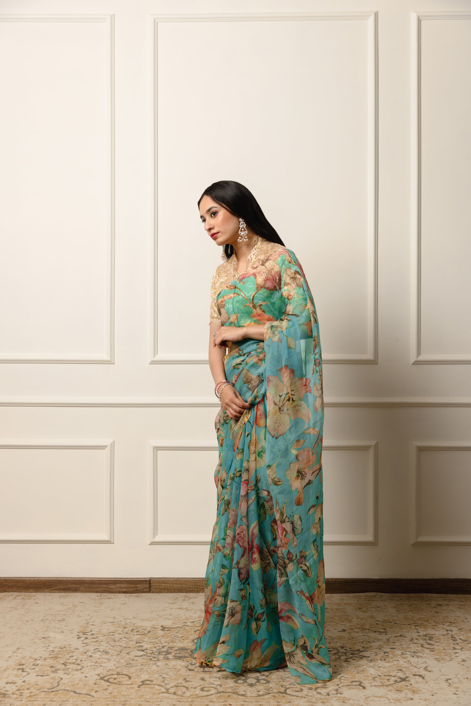 Printed French chiffon saree with a Chantilly lace blouse piece.