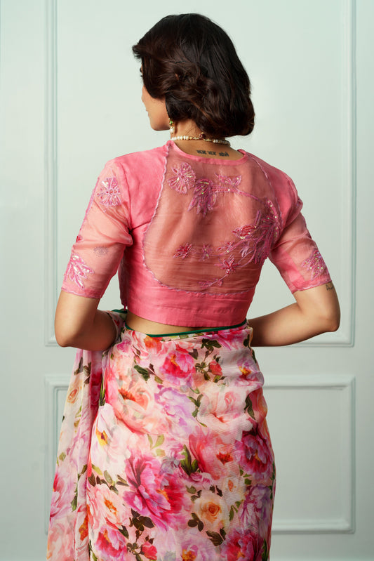 Peach to Pink ombre shaded chiffon saree with jaal all-over
