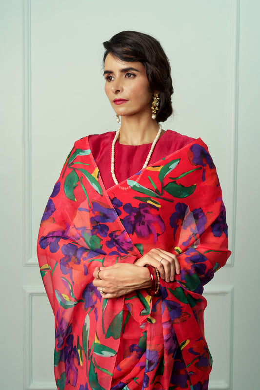 Peach to Red ombre shaded chiffon saree with cutwork jaal