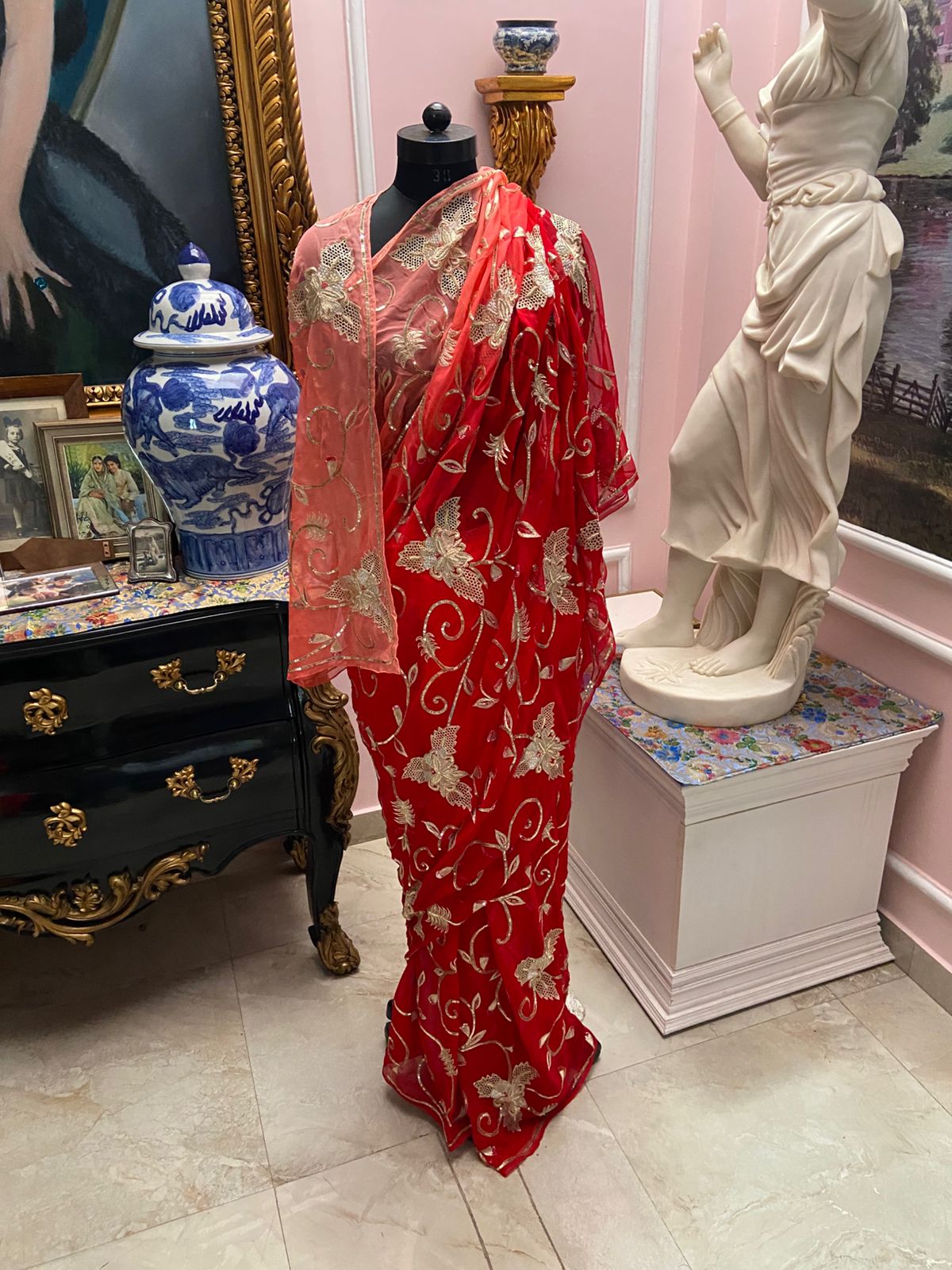 Peach to Red ombre shaded chiffon saree, embroidered with cutwork jaal all over, paired with a silk satin blouse.