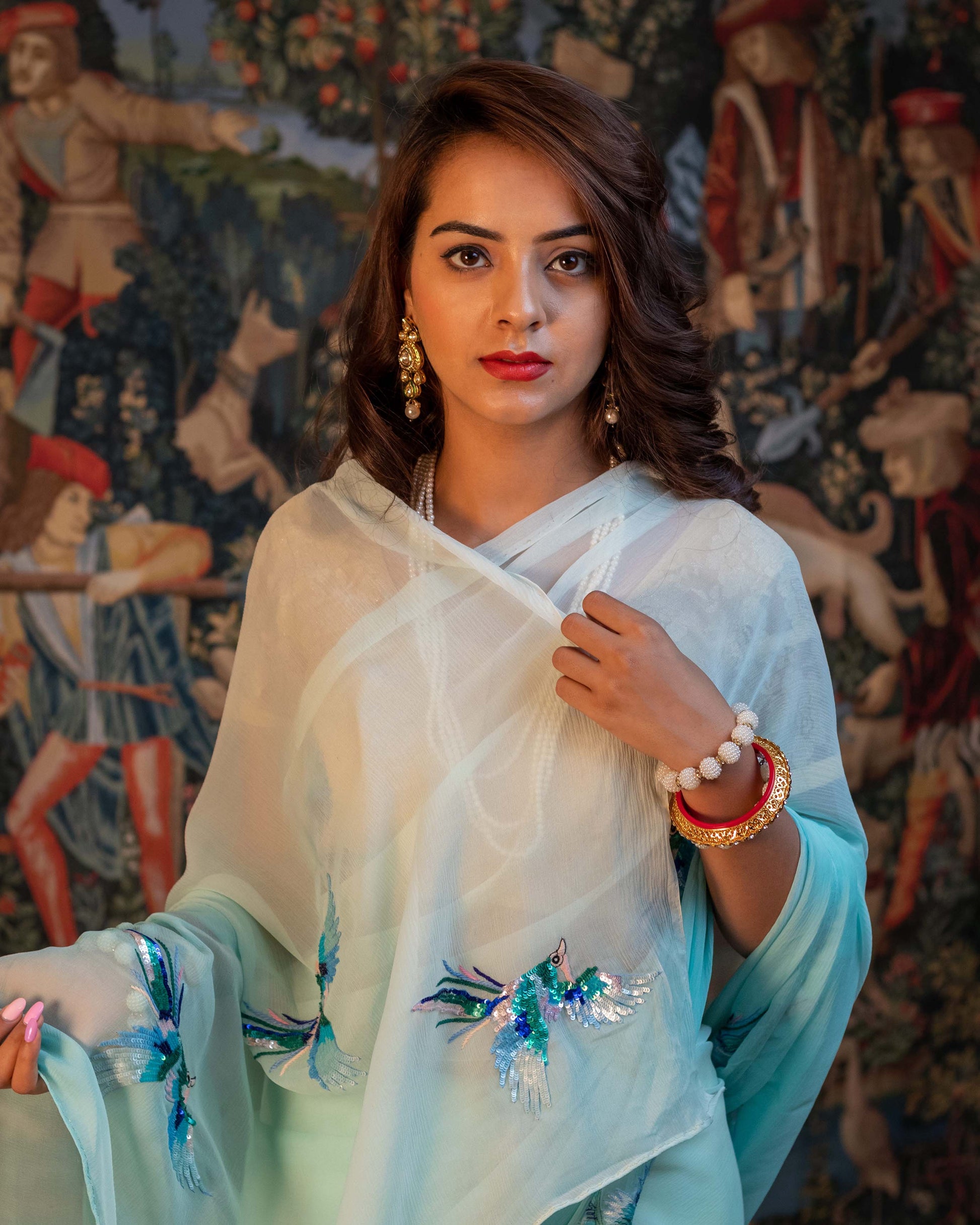 Ombré Azure Chiffon embroidered with mythical birds in a myriad of pastel sequins.