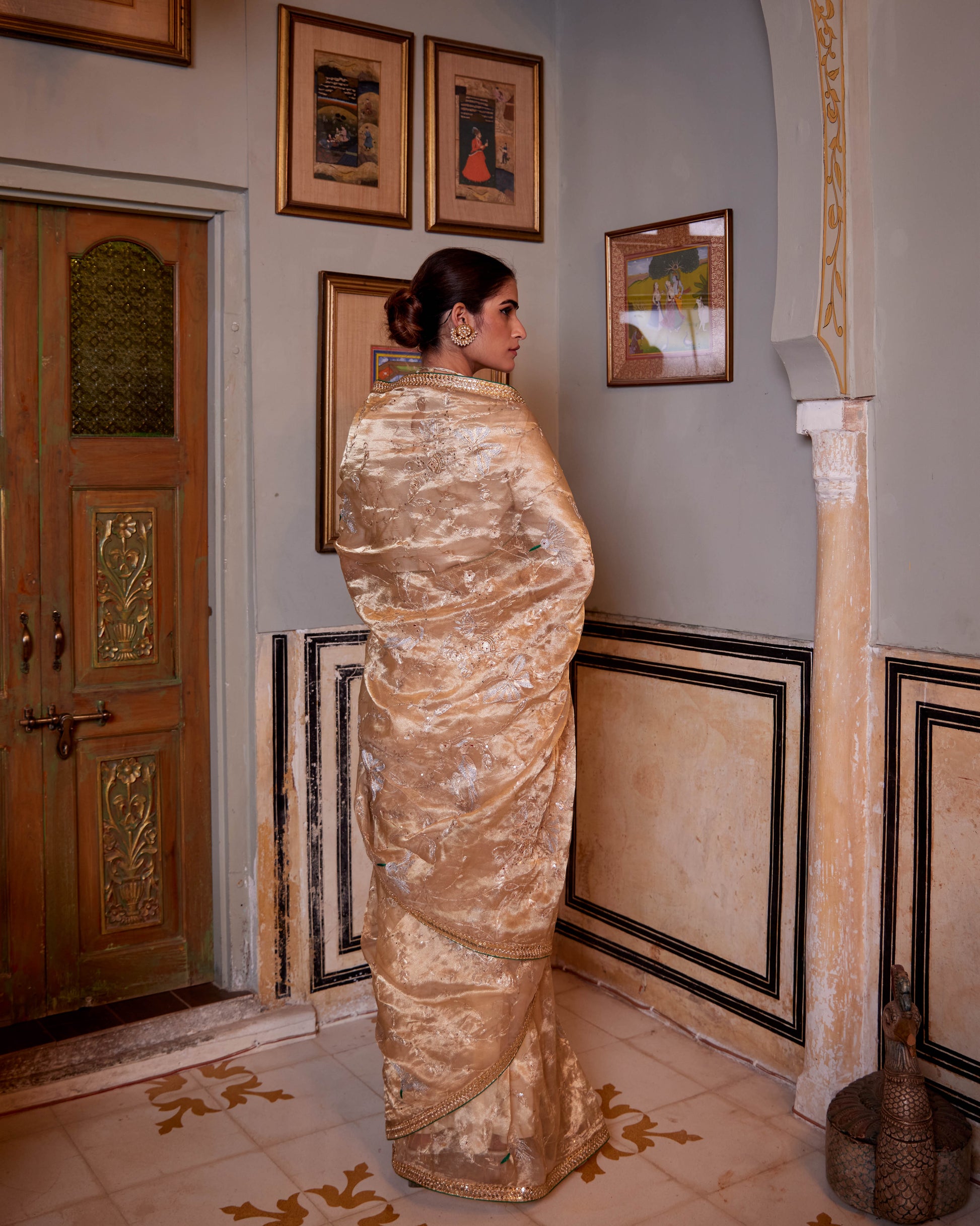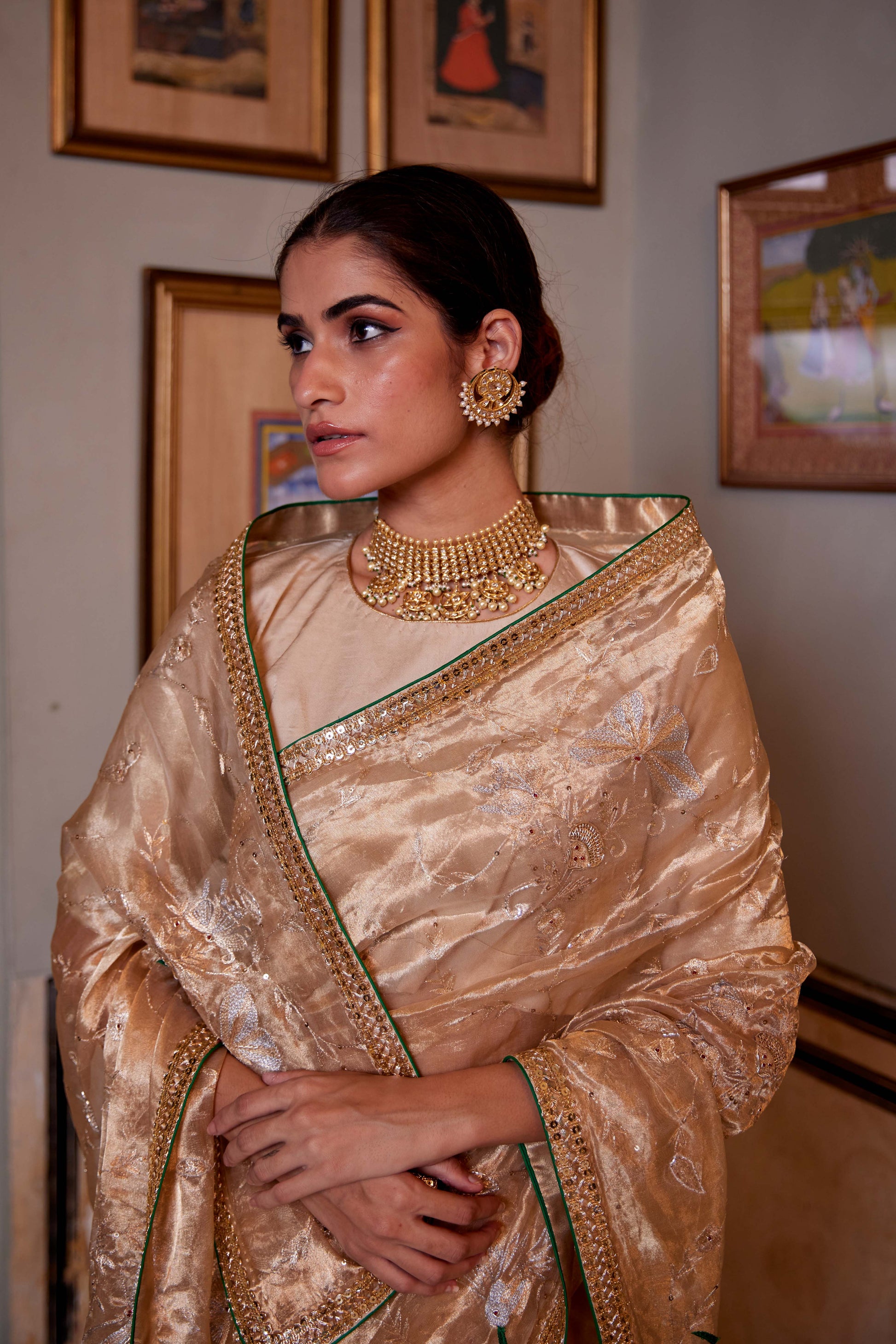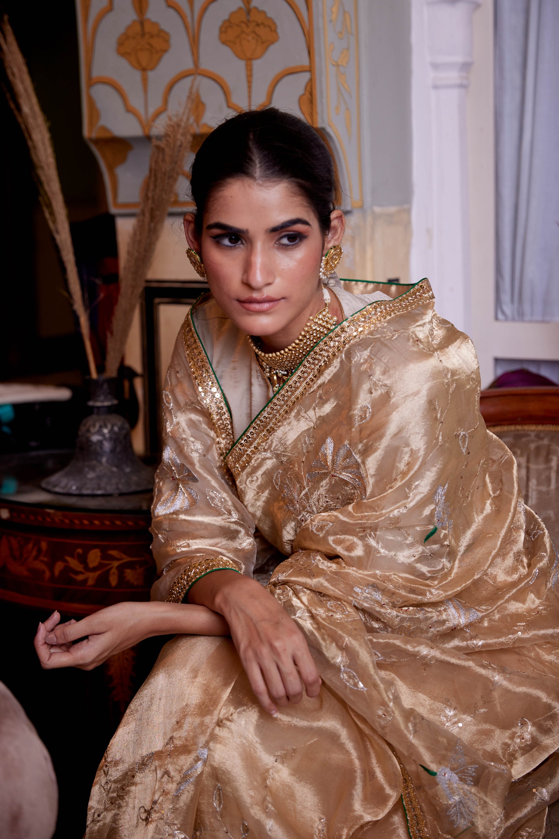 Kaaga Koyal gold tissue saree , embroidered in ganga/Jamuni aari zardozi embroidery, finished with handmade kinore, paired with gold tissue blouse.