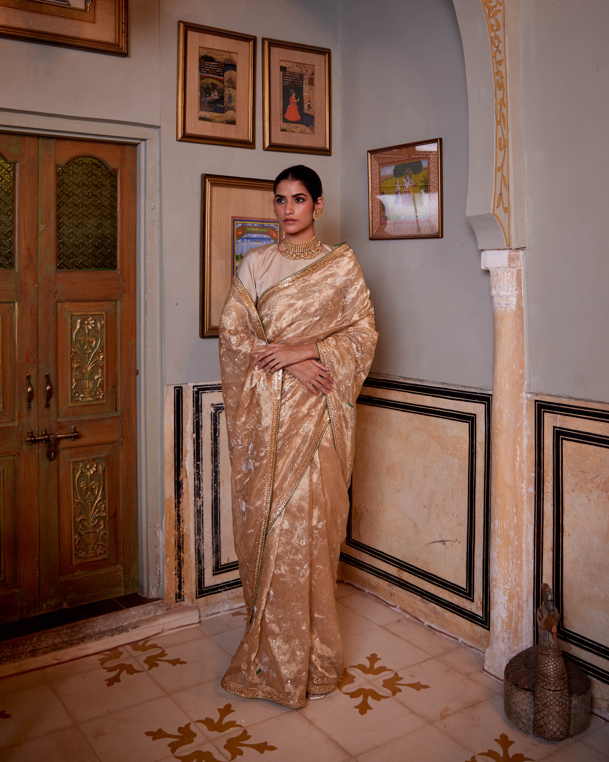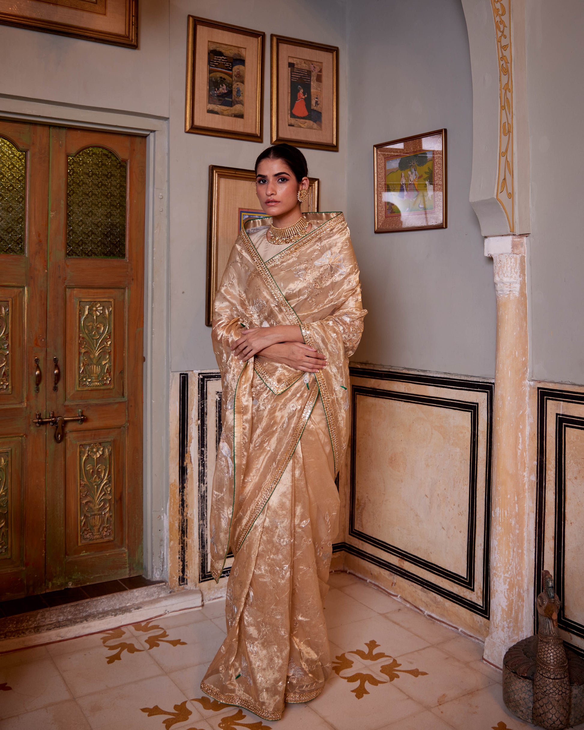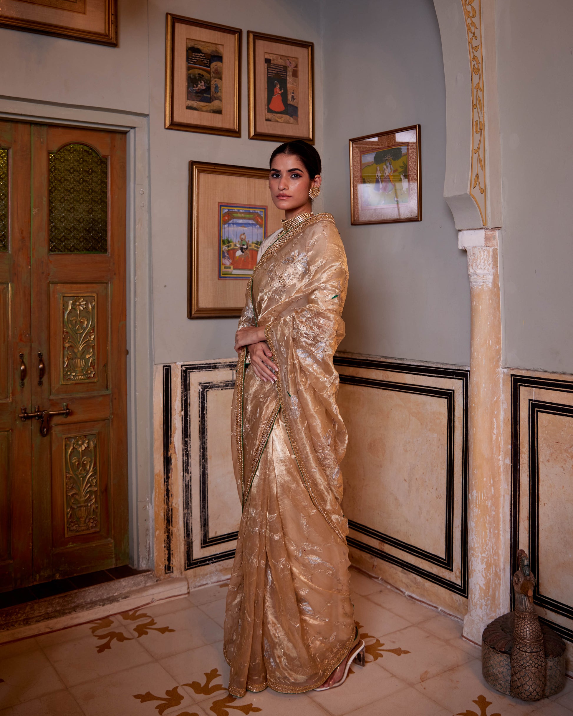 Kaaga Koyal gold tissue saree , embroidered in ganga/Jamuni aari zardozi embroidery, finished with handmade kinore, paired with gold tissue blouse.