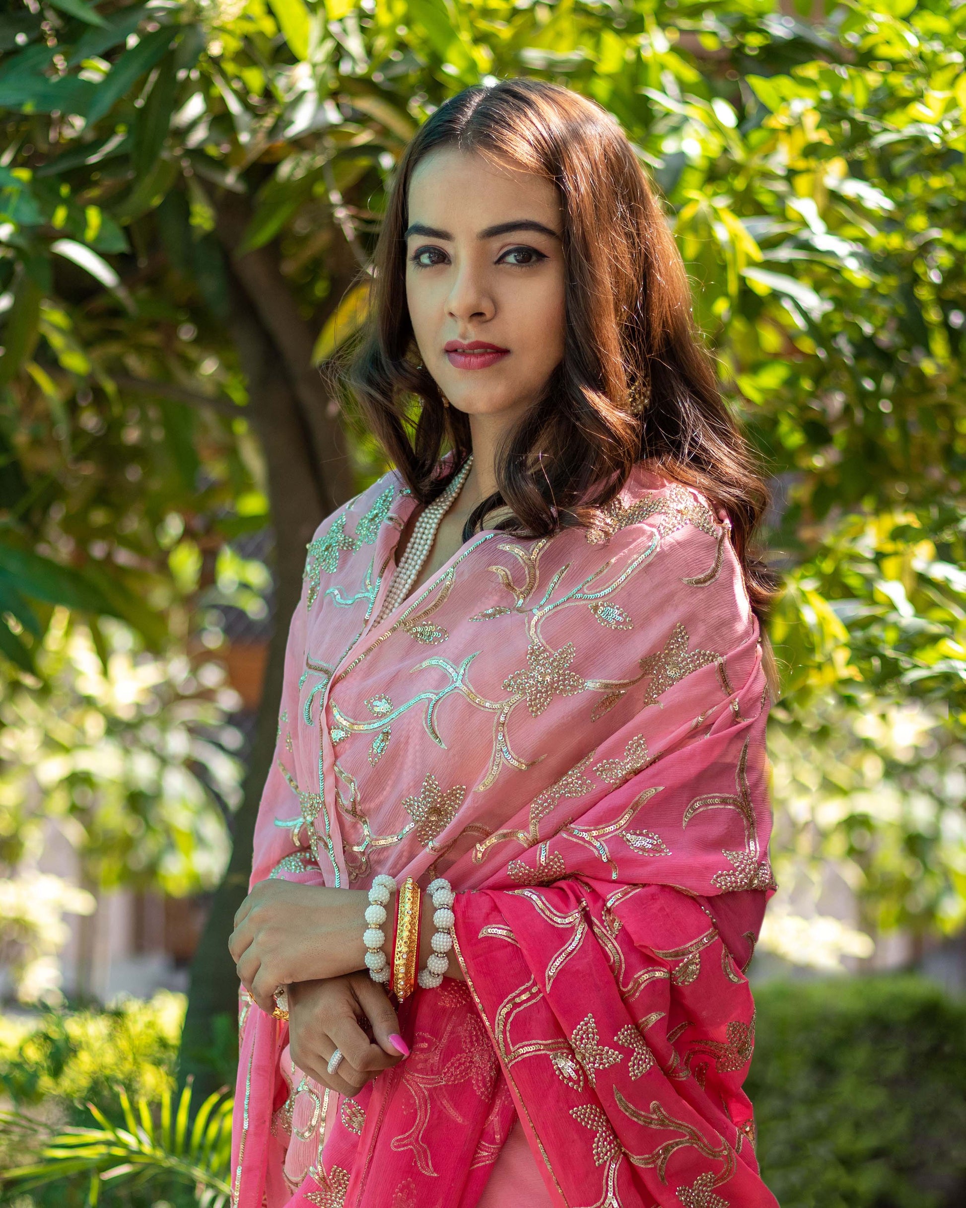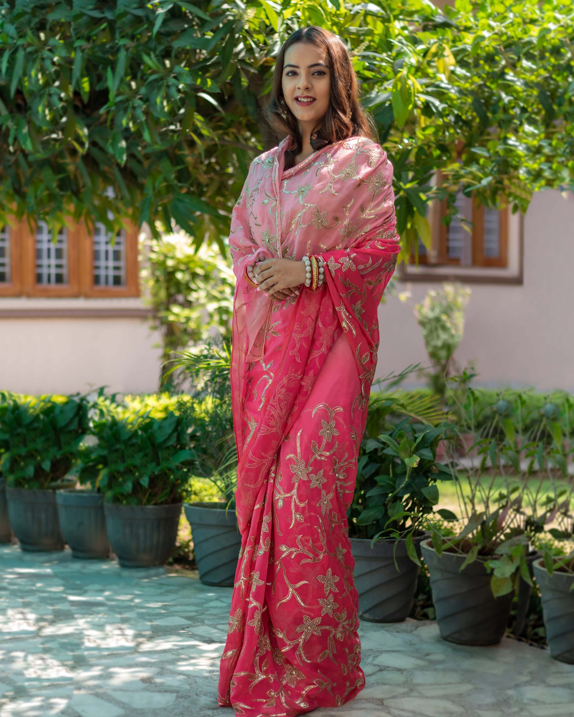 Fiery Sunset pink Ombré chiffon with floral Jaal embroidered with French cut sequins and Zari.